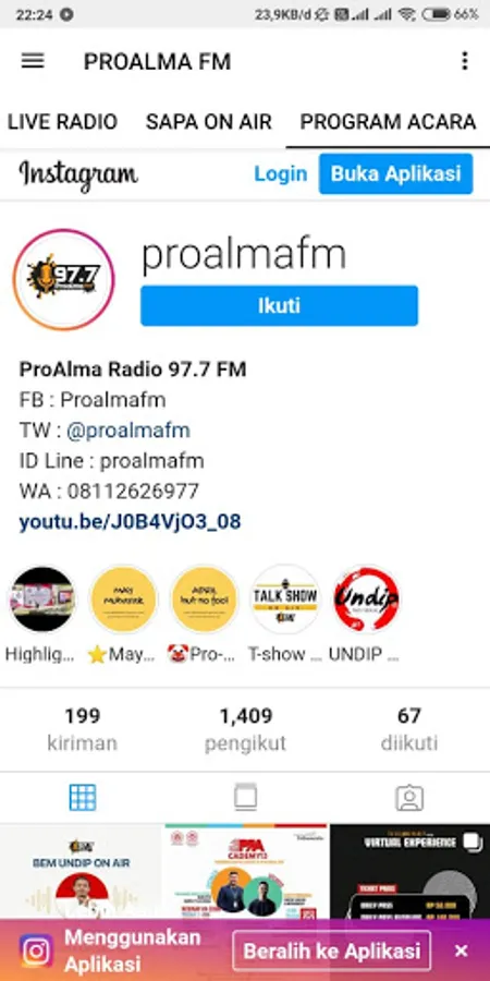 Radio Proalma 97.7 FM (PT. RADIO SUARA UNDIP) is a business unit owned by Diponegoro University, comes with a different concept face and color compared to other radio media. It airs non-stop 24 hours playing the best songs, able to be friends wherever they are activities. We can also be accessed via streamming at www.proalmafm.id and for Android users, you can download it at the ProAlma FM playstore. Bring fresh concepts and creative ideas and always care about the development of science and technology and community activities in the current era. Dense with a variety of information contents ranging from actual information, lifestyle, education and entertainment, we are sure to be the radio of choice for the dynamic, caring and inspiring young generation of millennials.