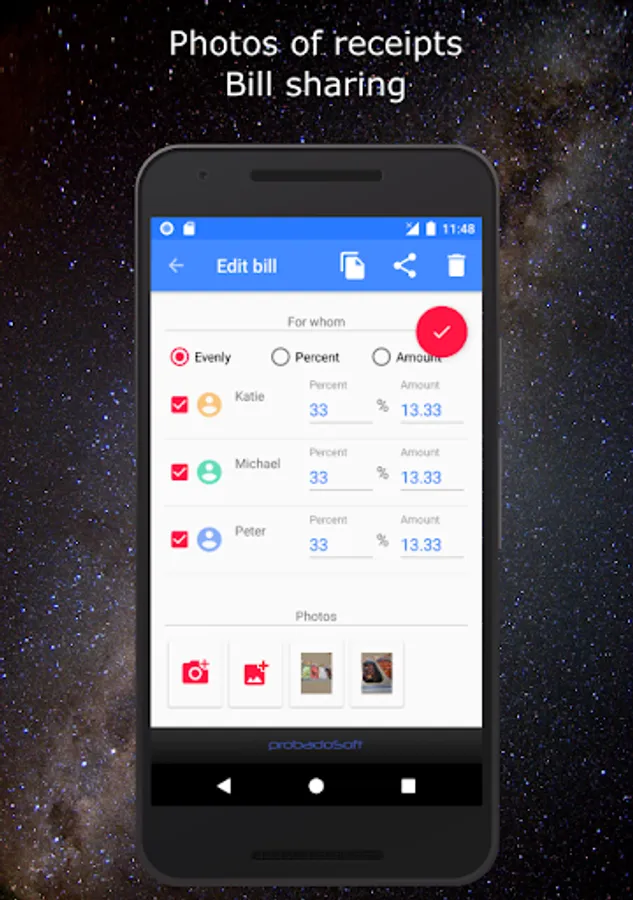 Take a picture of the receipt, invoice, purchase document, contract and save them in the Split Bills app. Thanks to this, you can always have important documents with you (even if you lose or destroy the originals).