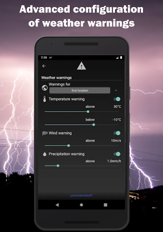 WEATHER WARNINGS! If you want to be up to date of the parameters important for you (temperature, wind, precipitation) - configure alarms in the application! Set appropriate thresholds, beyond which you will receive a notification with a weather alarm. For example, you can receive notifications if the temperature drops below 14°F (-10°C).