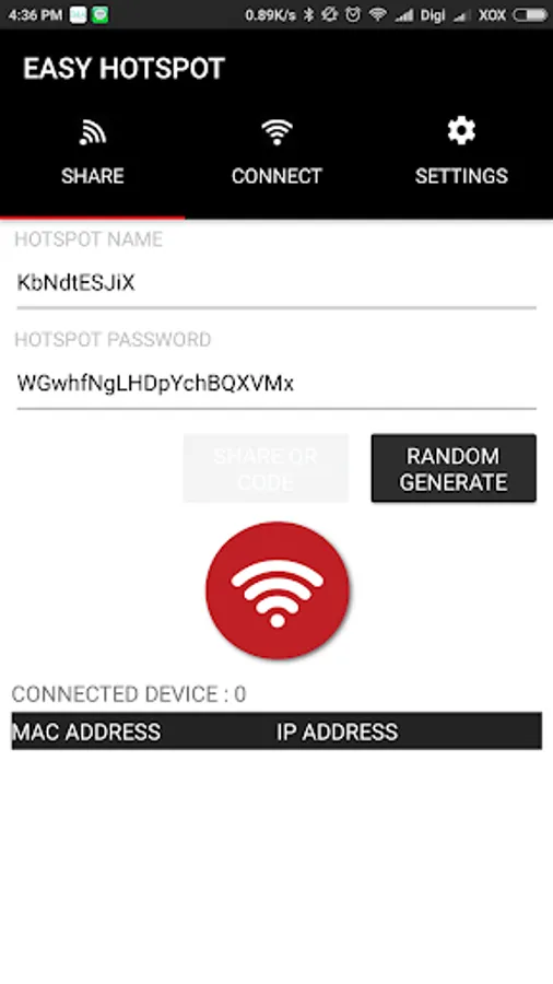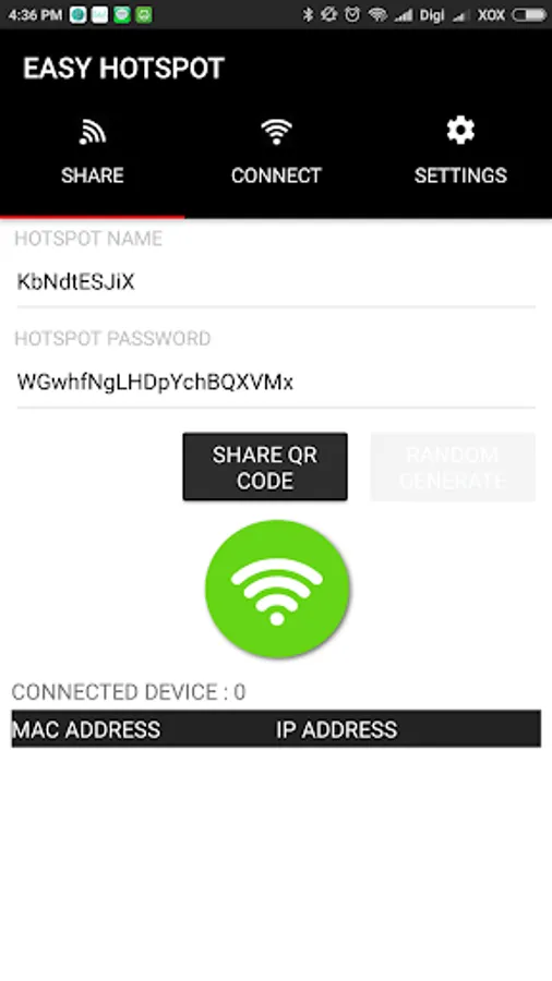 Just click random generate button to generate the user and password, then enable the hotspot by click the enable button. That's all.