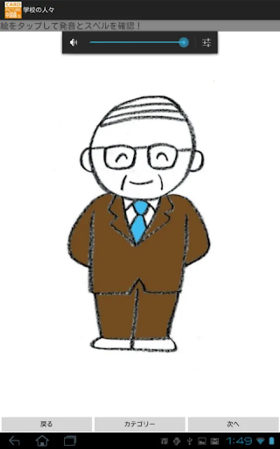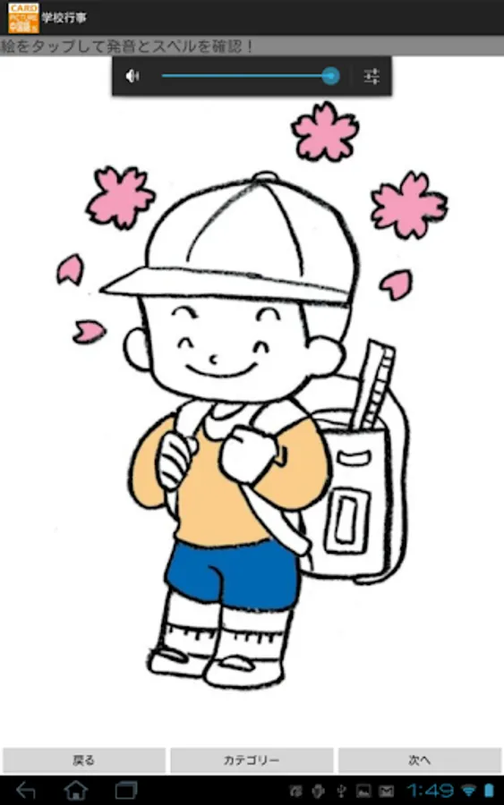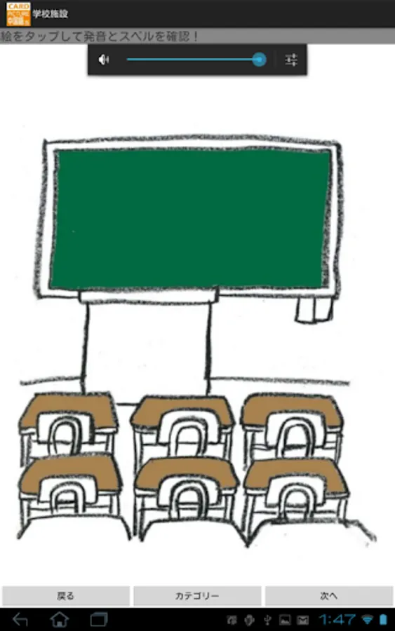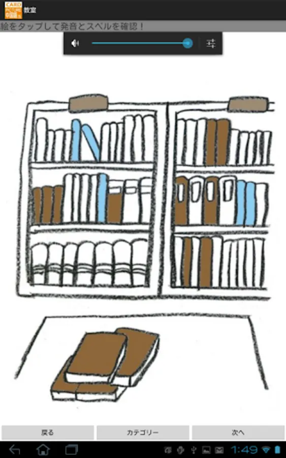 カードを開いて絵をタップすると英語と日本語の音声がながれて、何度でも繰り返して発音練習ができます。