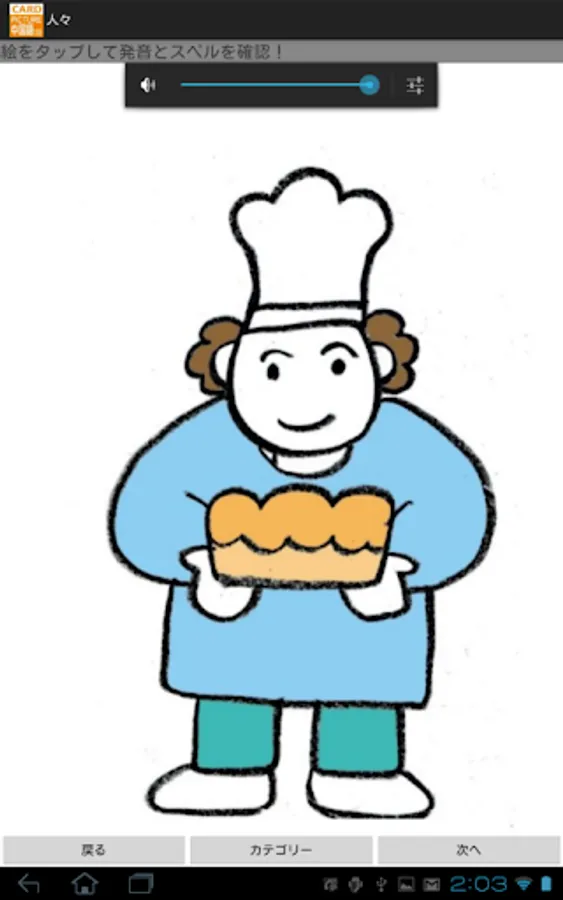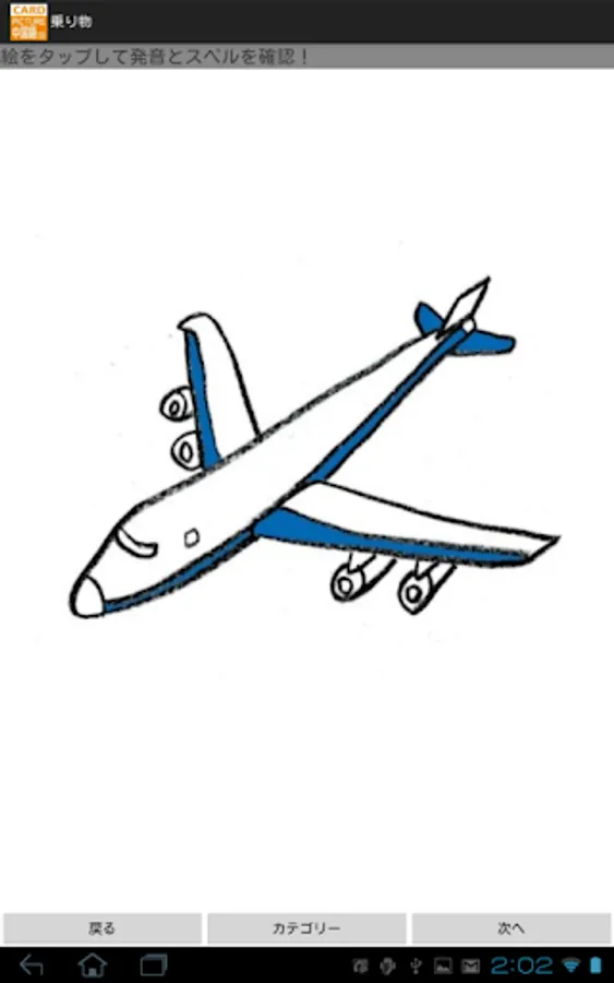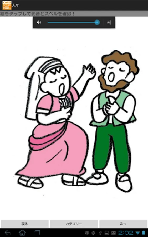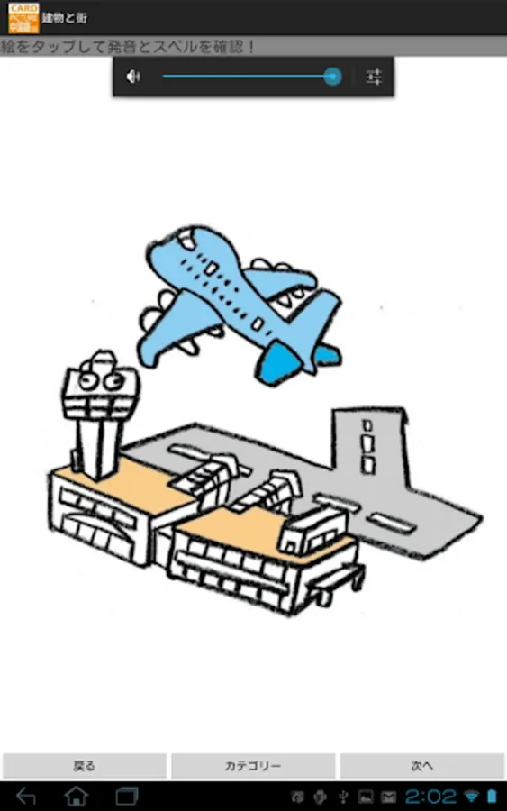 カードを開いて絵をタップすると英語と日本語の音声がながれて、何度でも繰り返して発音練習ができます。