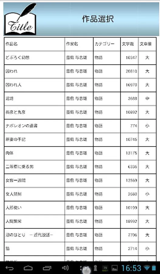 VOL 件数 タイトル カテゴリー 作家名 文字数 文字量