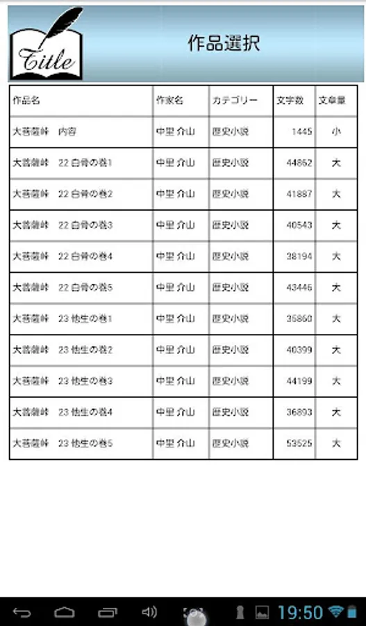 NO VOL 件数 選択 作家名 タイトル名 カテゴリー 文字数 文章量