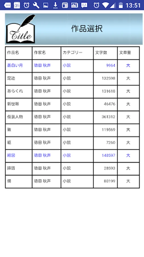 NO VOL 件数 選択 作家名 タイトル カテゴリー 文字数 文字量