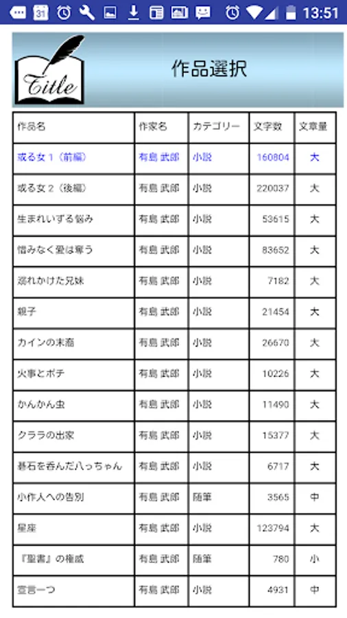 NO VOL 件数 選択 作家名 タイトル カテゴリー文字数 文字量