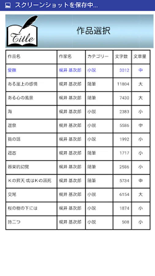 NO VOL 件数 選択 作家名 タイトル カテゴリー文字数 文字量