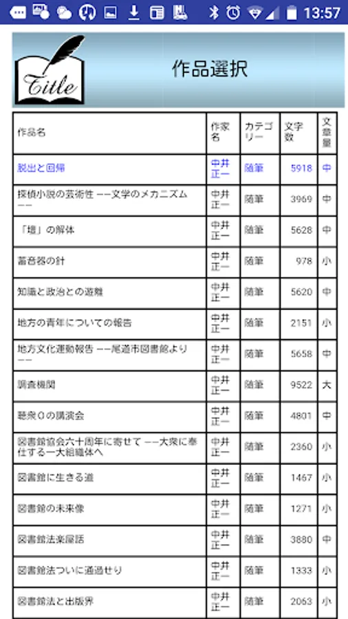 vol 件数 作家名 タイトル カテゴリー/文字数/文字量