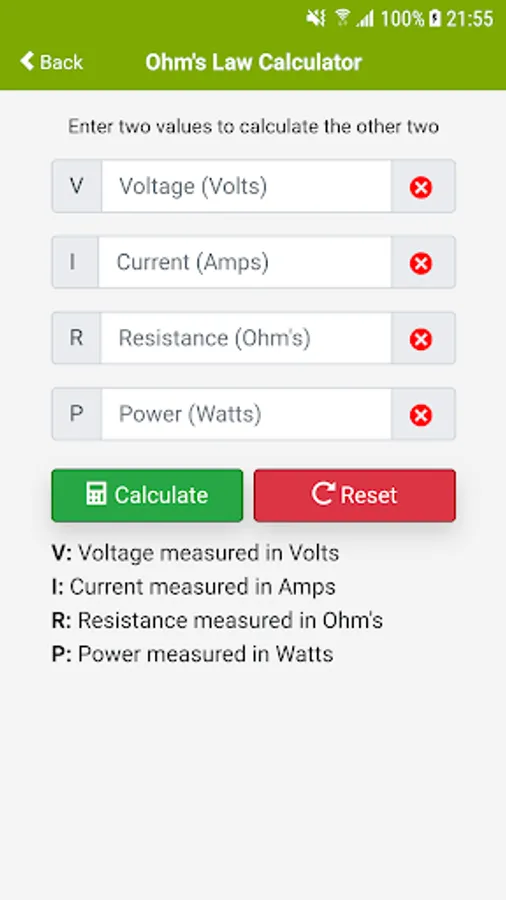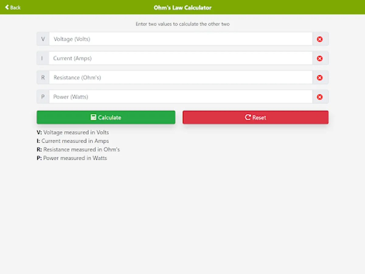 Voltage Calculator Current Calculator Resistance Calculator & Power Calculator all in one app.