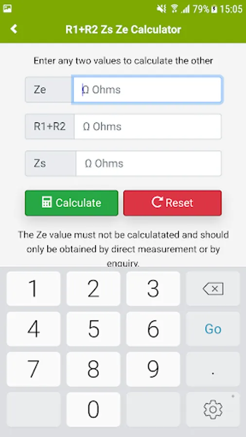 Although this app allows the calculation of the Ze, the Ze should not be calculated, the Ze value should be obtained by actual measurement or by inquiry to the regional electric company. It is best practice to directly measure the R1+R2 and Zs values .