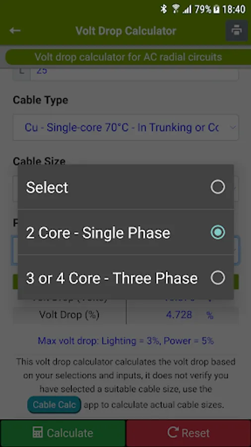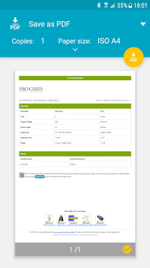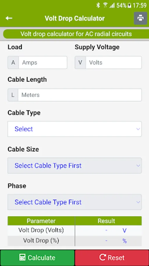 Voltage drop calculator to calculate voltage drop for electrical circuits and cables, save as PDF file or print the volt drop calculation results directly from your Android device.