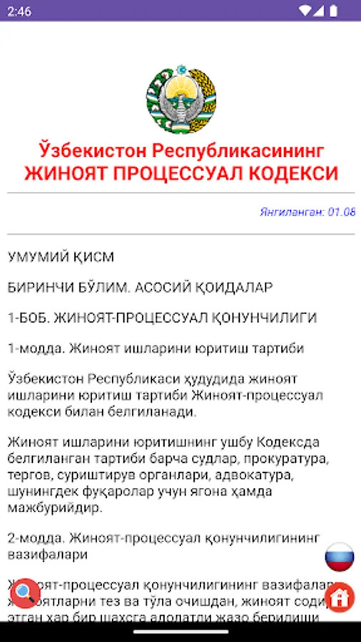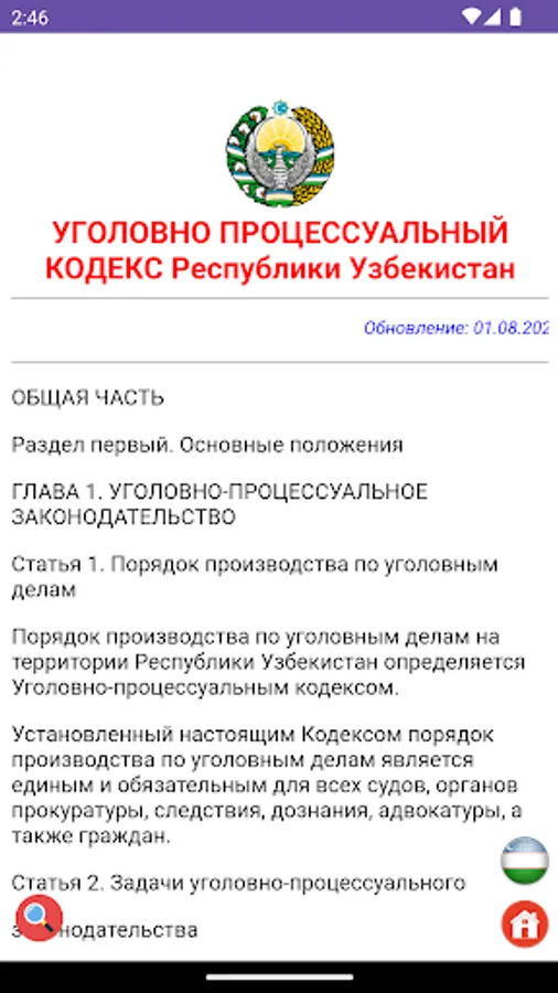 The procedure for criminal proceedings on the territory of the Republic of Uzbekistan is determined by the Code of Criminal Procedure. The procedure for criminal proceedings established by this Code is uniform and mandatory for all courts, prosecution, investigation, inquiry, advocacy bodies, as well as citizens.