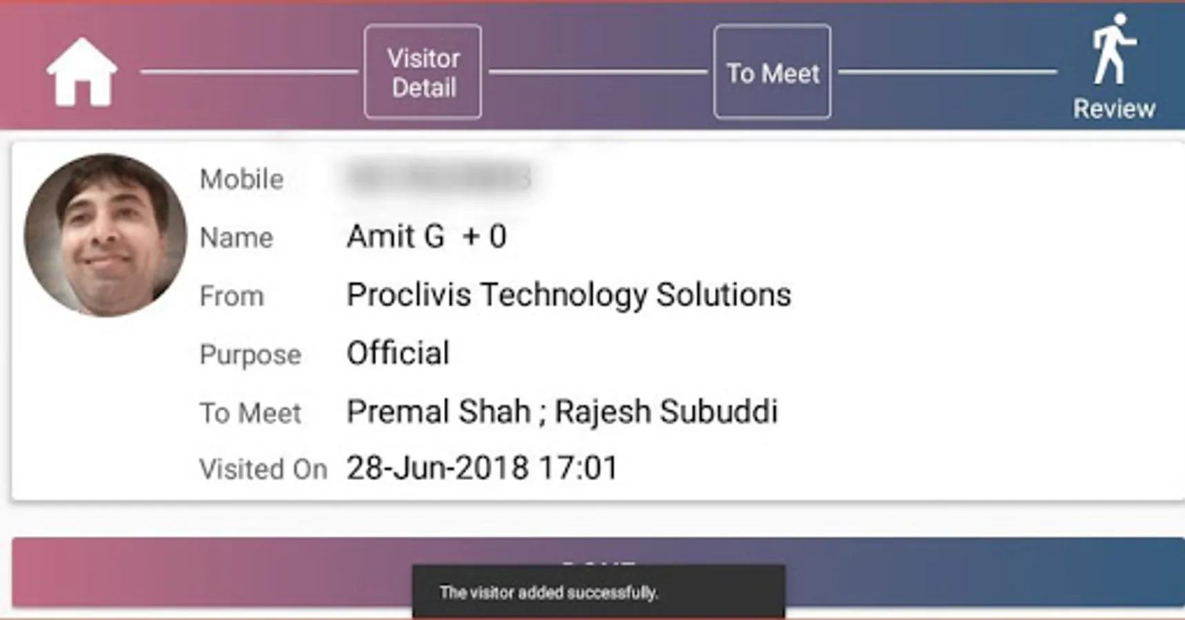 - The app is intelligent to auto-fill the last information entered by the visitor in case he revisits the residential apartment / society. This enables the visitor quicker data entry
