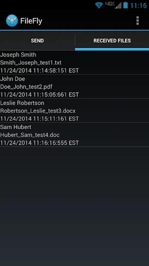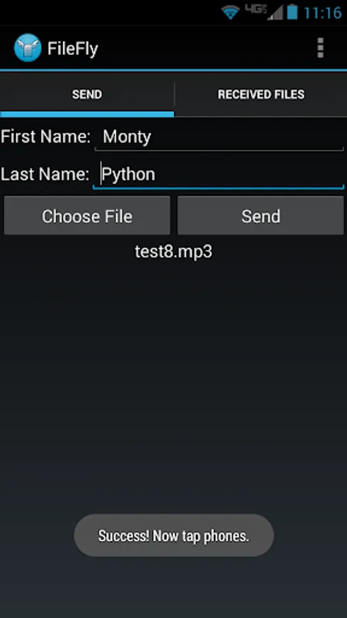 Share any file between Android phones via NFC transfer. The files are stored on the phone's external storage (SD Card). Track the files you have received by the sender's name, the filename, and the time they were shared. From the list of received files, you can select to open them or long press to delete the record for that file. The file itself is not deleted and will still remain on external storage.