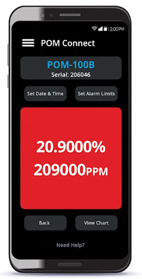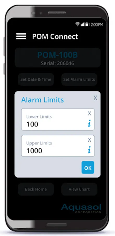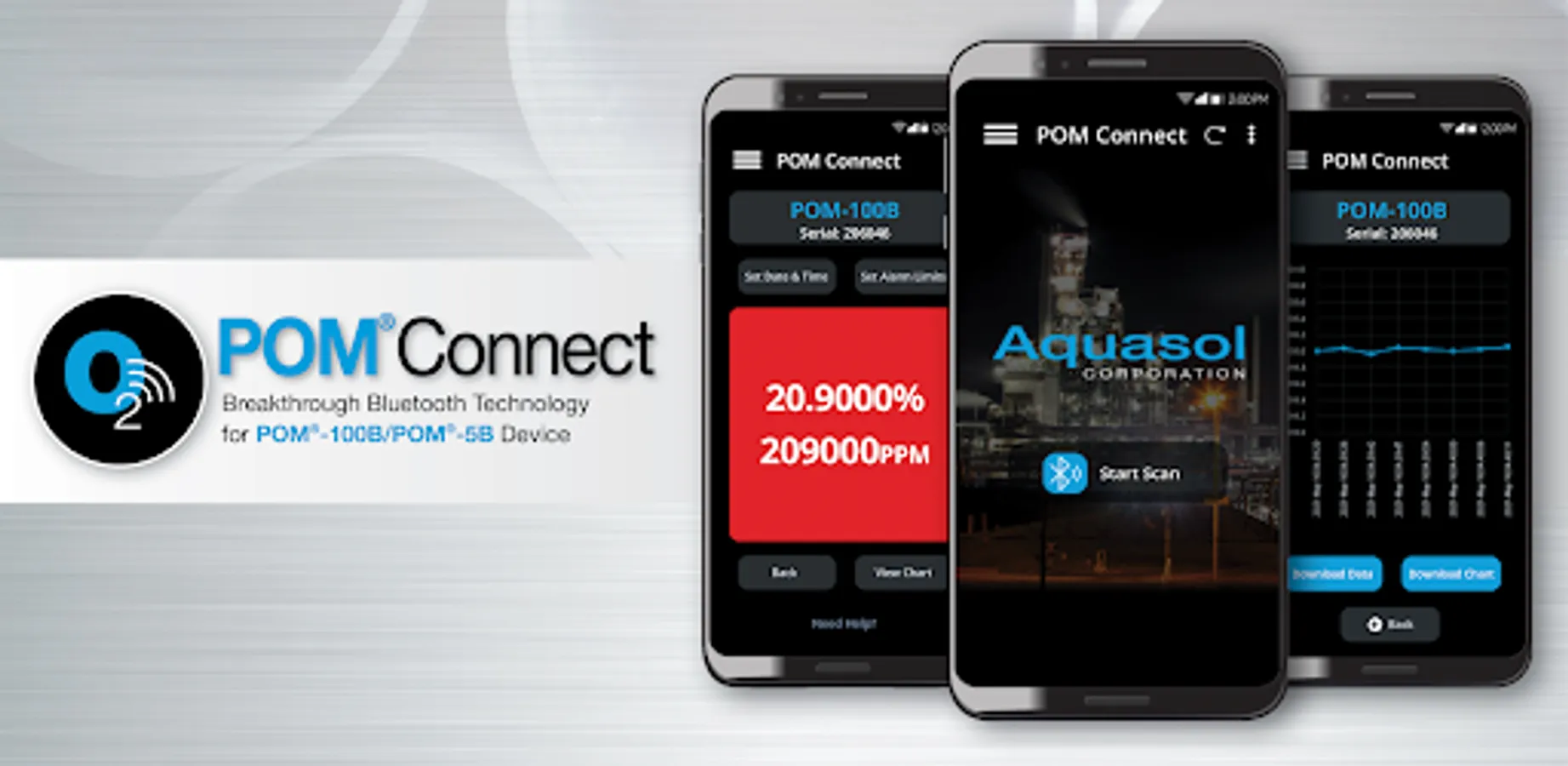- Scans and connects to POM-100B/POM-5B Oxygen Monitor from Aquasol Corporation