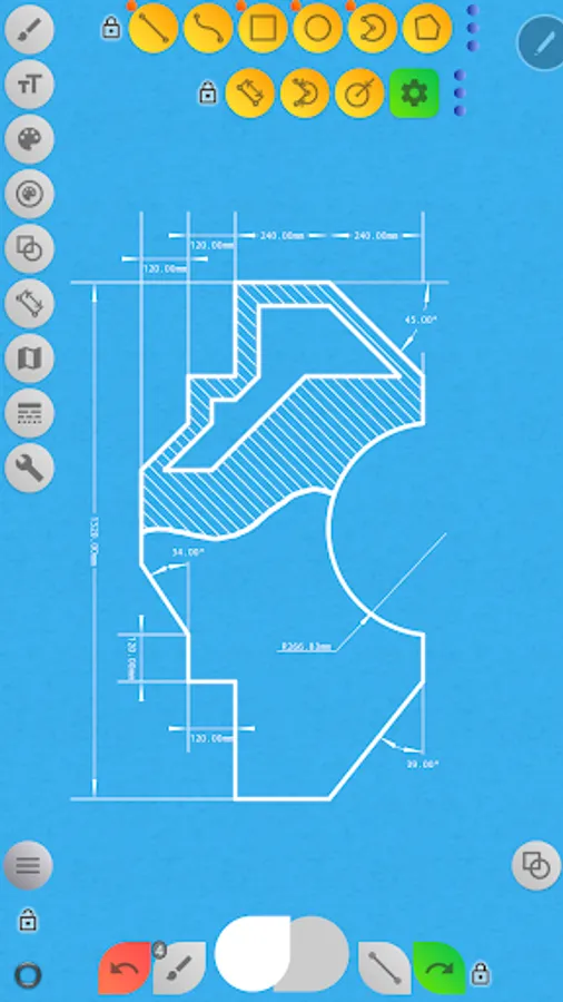 - Dimension tool for quick dimensioning (linear, angular, radius).