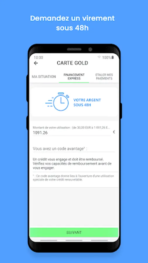 When you need money, it's right away => Ask for Express Financing (special use of your revolving credit) 24 hours a day, 7 days a week. Choose the amount you need and receive your money within 48 hours without proof additional project.