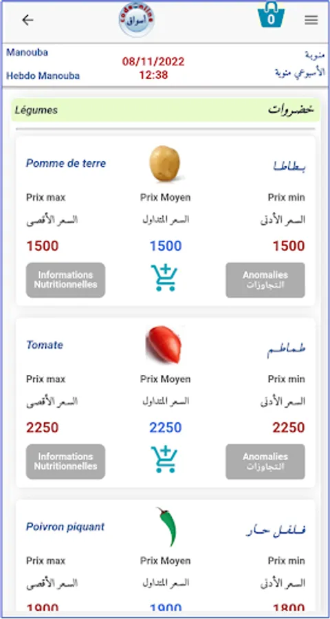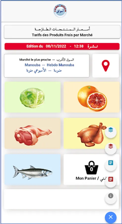 Daily visibility in Tunisia of the prices of fresh agricultural products in the five retail markets closest to your GPS position: