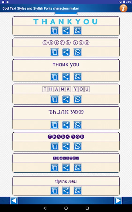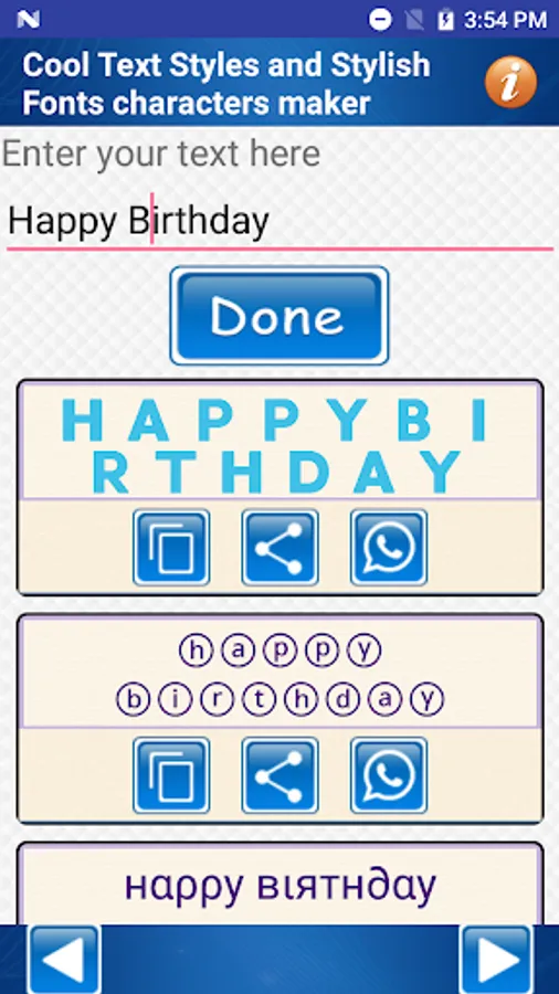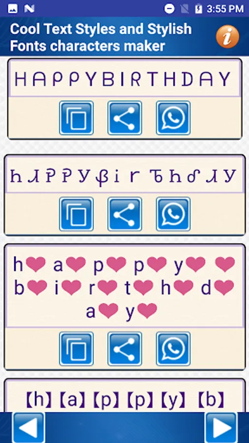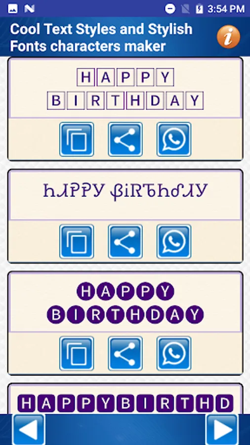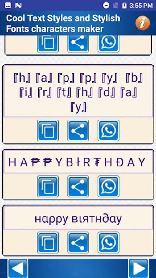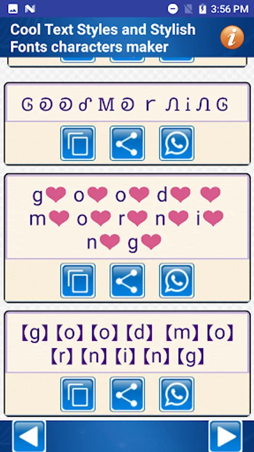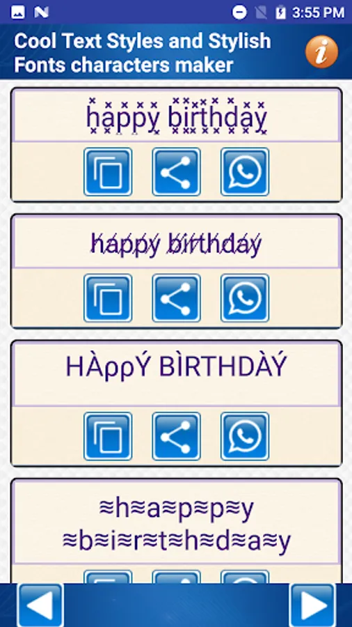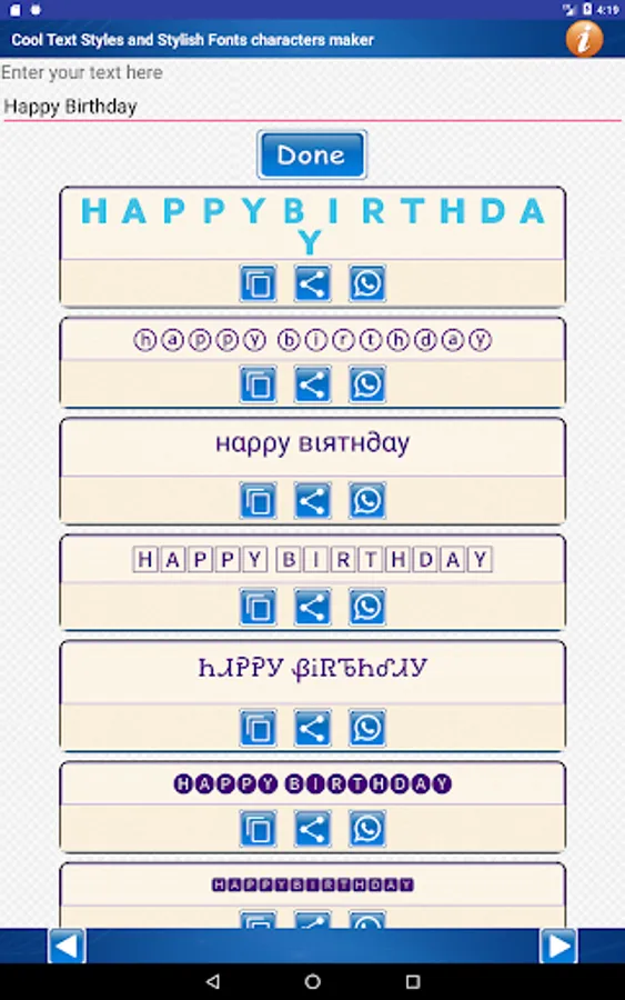 This is a Free android App to create Cool Fancy Text styles and to make Stylish Fonts Effect to share your attitude on WhatsApp Facebook Twitter etc social media and chat messengers with easy single touch tap share or using copy and paste.