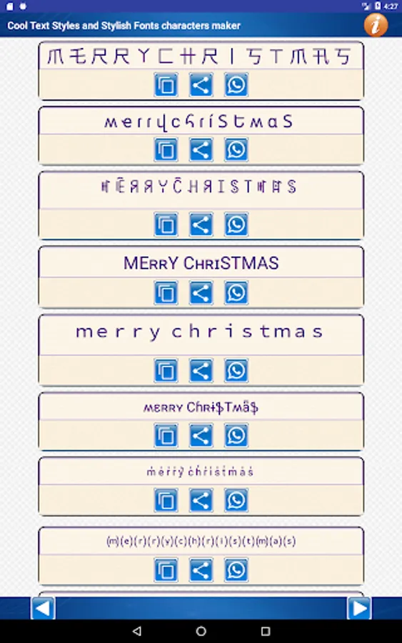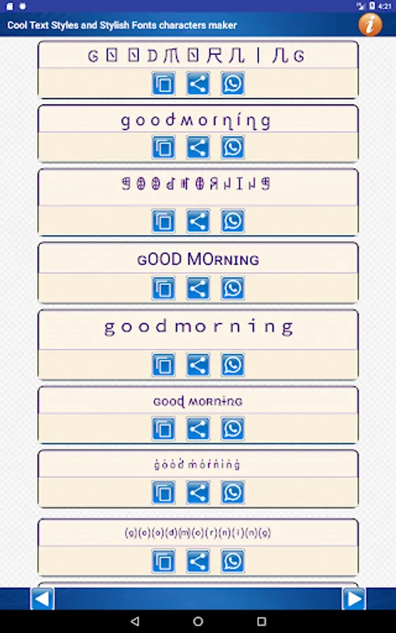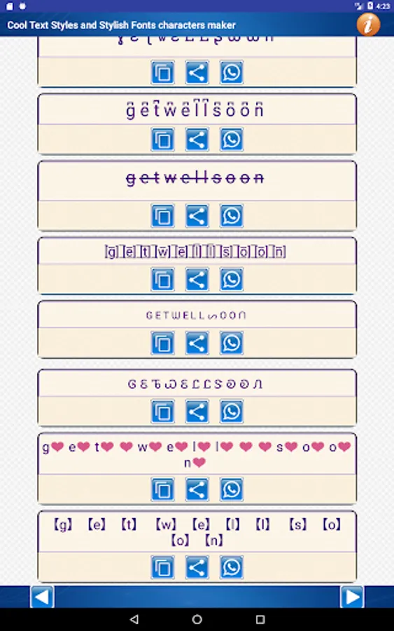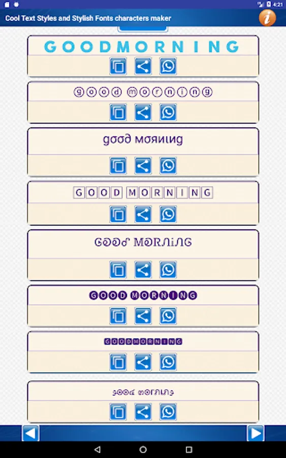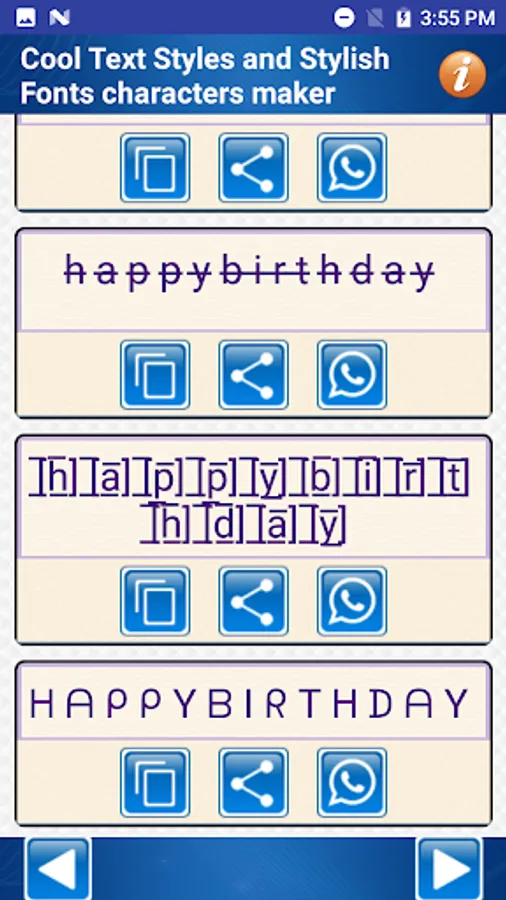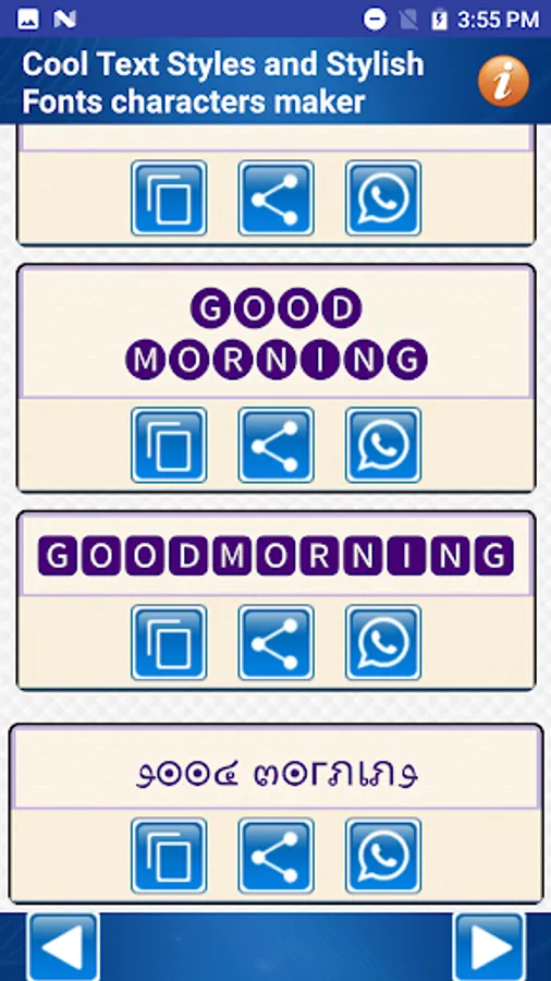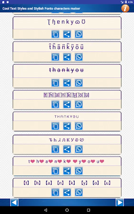 This is a Free android App to create Cool Fancy Text styles and to make Stylish Fonts Effect to share your attitude on WhatsApp Facebook Twitter etc social media and chat messengers with easy single touch tap share or using copy and paste.