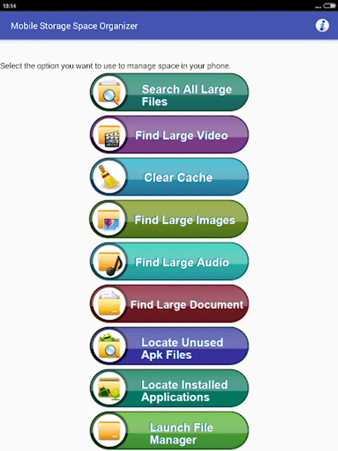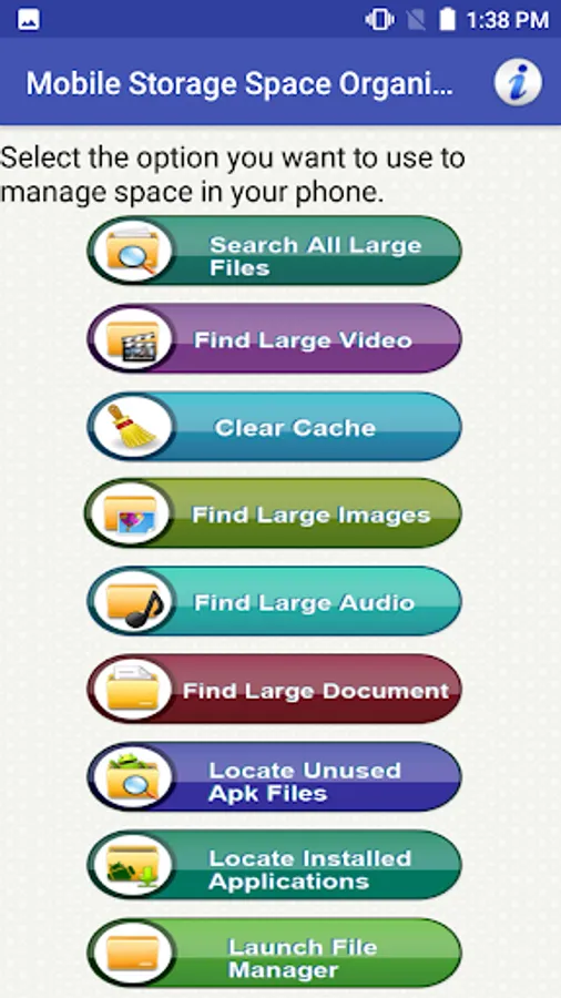 Mobile Storage Space organizer App helps you to easily browse and mange your important files documents videos find your downloaded files and manage storage space. This File Manager helps you to categorize files for you with its smart features and you can easily access photos videos music files large files documents and other precious files. Mobile Storage Space organizer App allows you to manage all your files whether they are store in your phone device or memory card.