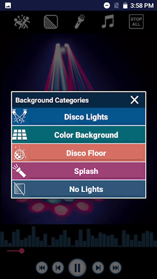 * You can choose the different background categories like Disco lights color background disco floor splash No light.