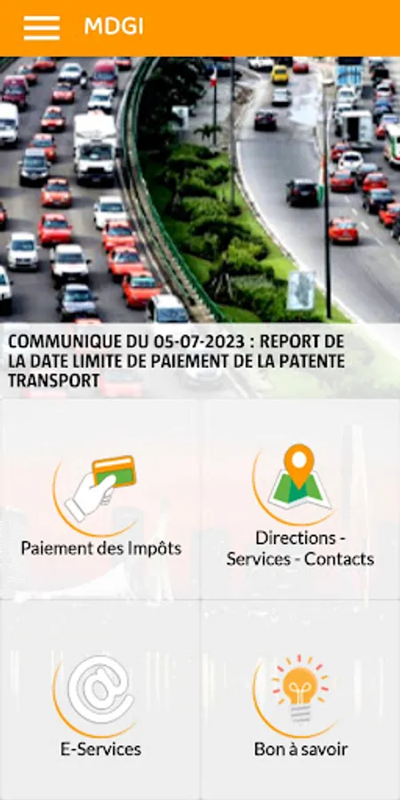 MDGI is an application offered by the DGI (Direction Générale des Impôts de Côte d'Ivoire) to improve the quality of service in the front office.