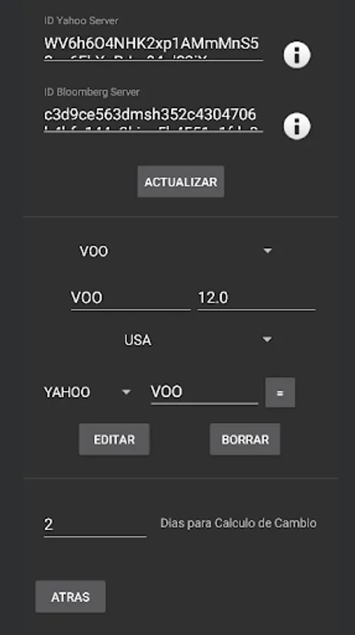 To be able to access the data from the servers, just enter the API Key of the Yahoo Finance and Bloomberg servers (links directly in the application settings). In order to obtain the API Key it is necessary to create a free account on each server directly in the mentioned links (each API Key is unique per user and per server).
