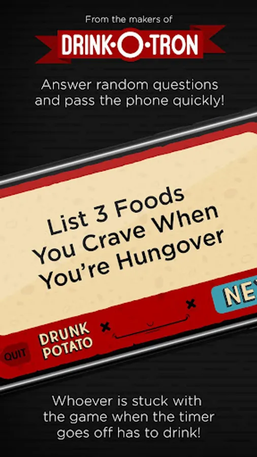 We took the classic Hot Potato idea, threw in some random (sometimes downright filthy) questions, a few dashes of booze, and abracadabra, you've got Drunk Potato! If you like your Drinking Games to be fast paced, then you're gonna live Drunk Potato.