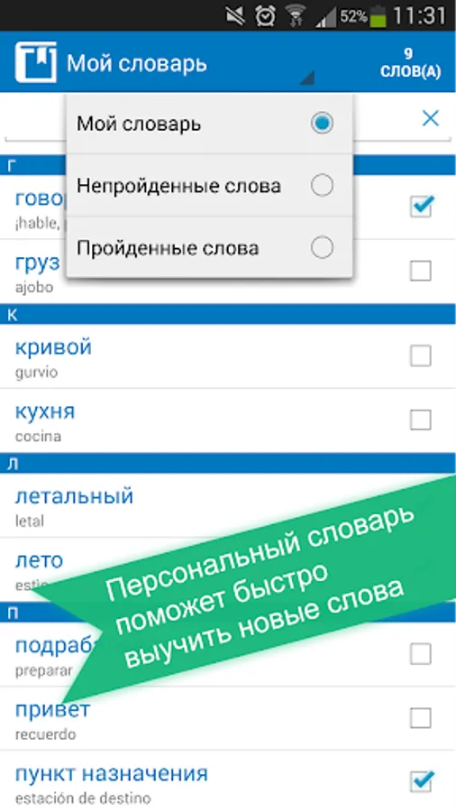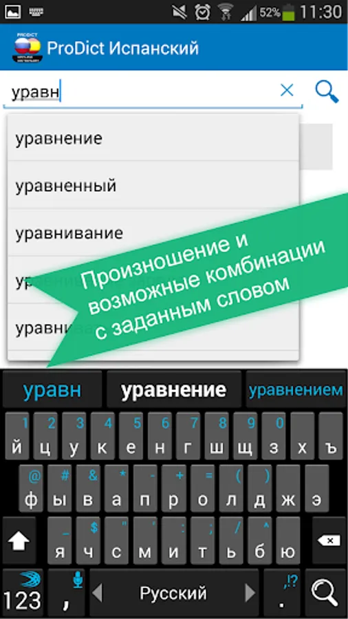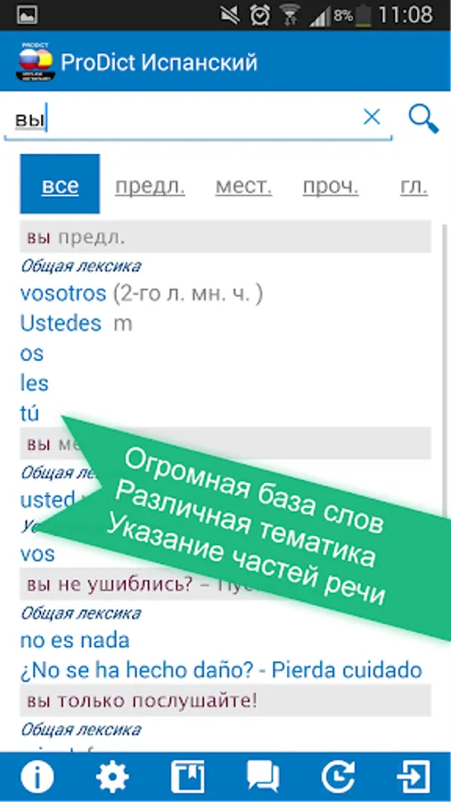 This is the largest Spanish - Russian offline dictionary available in Google Play Store. This dictionary contains 225.000 words, which are very diverse. Words you use in your daily life, but also words that have to do with specific themes, for example: logistics, history, technics, and so on.