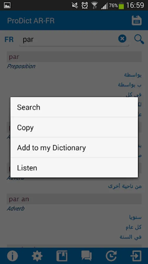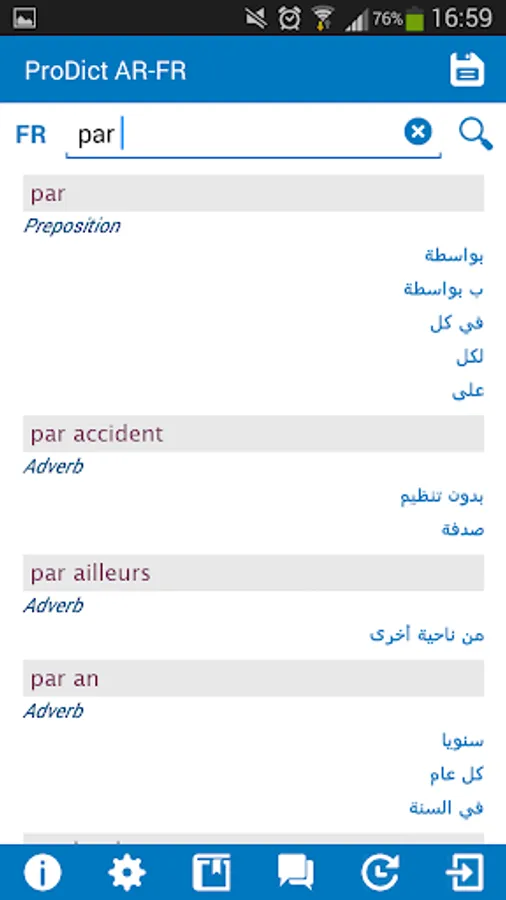 Simple, fast, convenient French - Arabic and Arabic - French dictionary which contains 81741 words. The Dictionary is OFFLINE and does not require an Internet connection. The dictionary contains the vocabulary trainer. This is an easy way to learn new words. قاموس عربي فرنسي