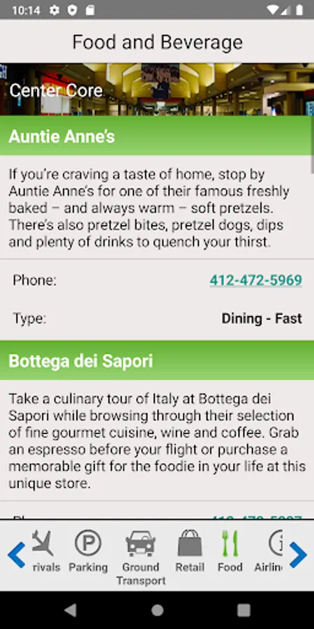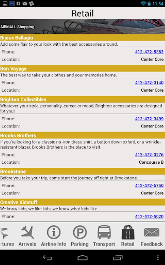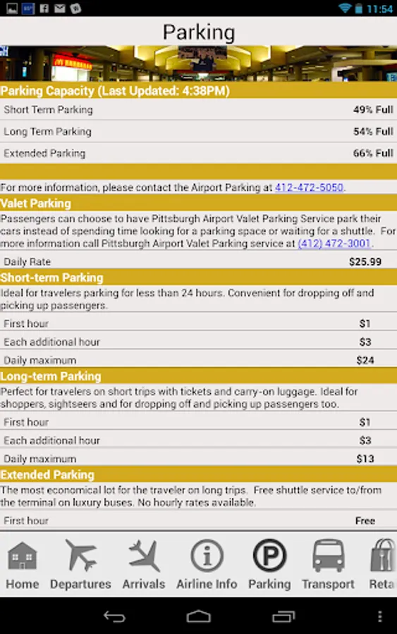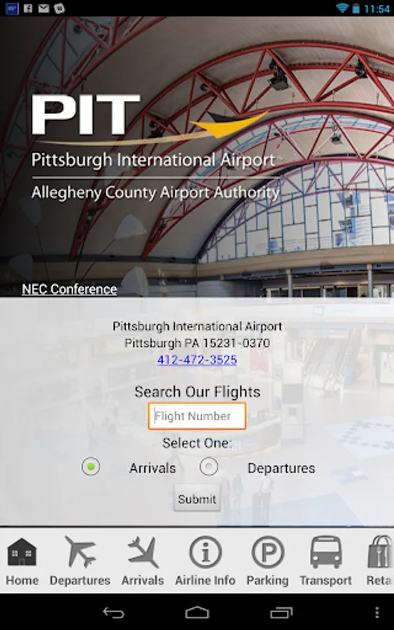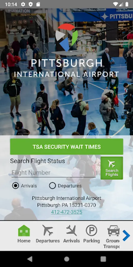 Pittsburgh International Airport's Official App features real-time flight arrival and departure information, including security wait times, and real-time parking capacities at the airport. It provides passengers with information about parking, airlines, ground transportation and the retail options at the Pittsburgh International Airport.