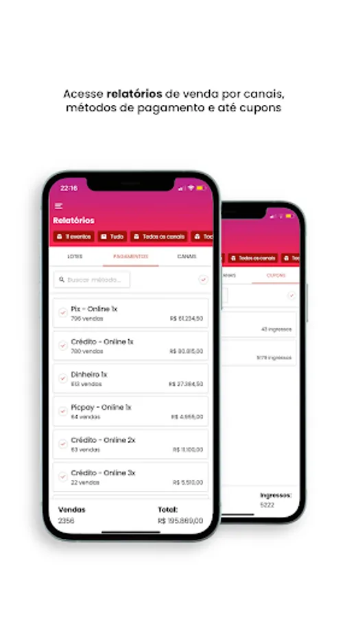 Dashboard with multi-event data; configuration of lots, discount coupons and promoters; sales reports by channels, by payment methods - and much more.