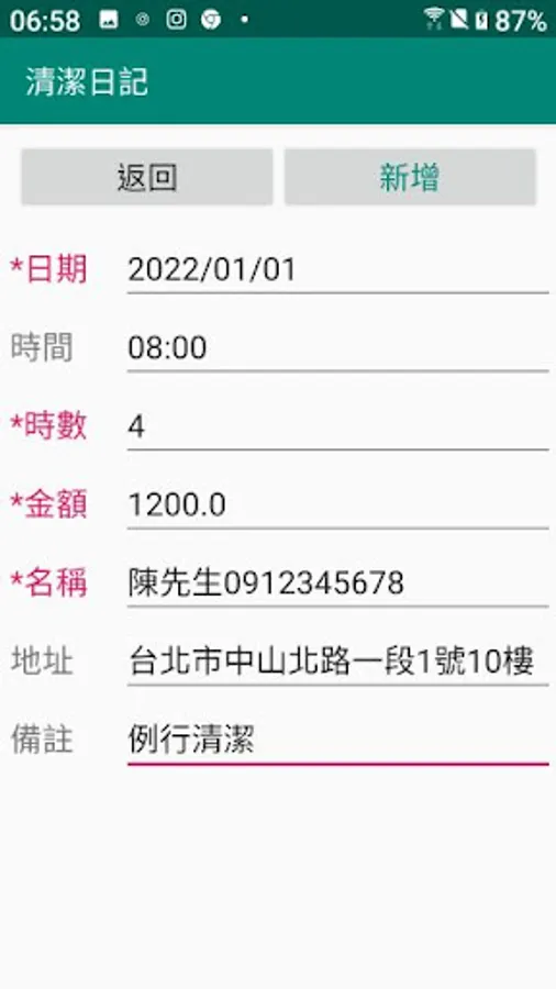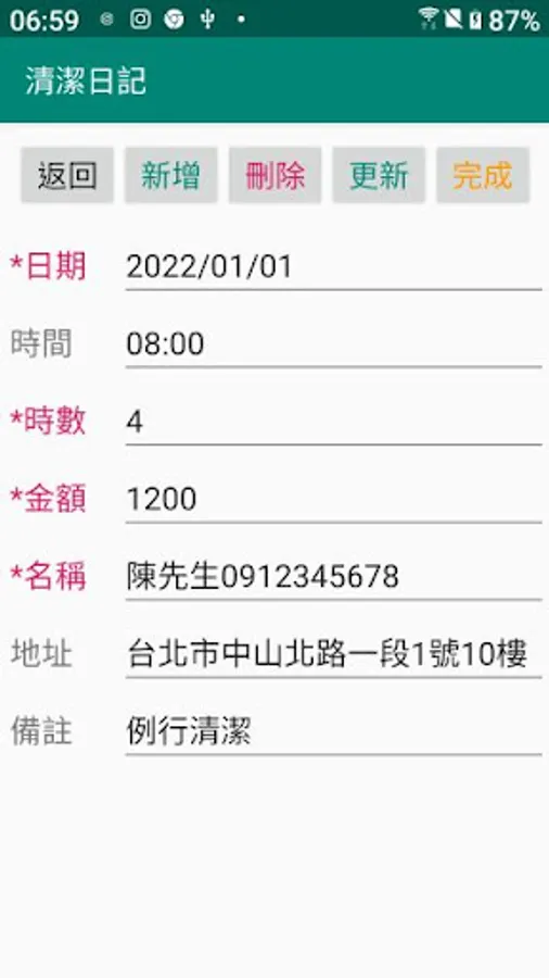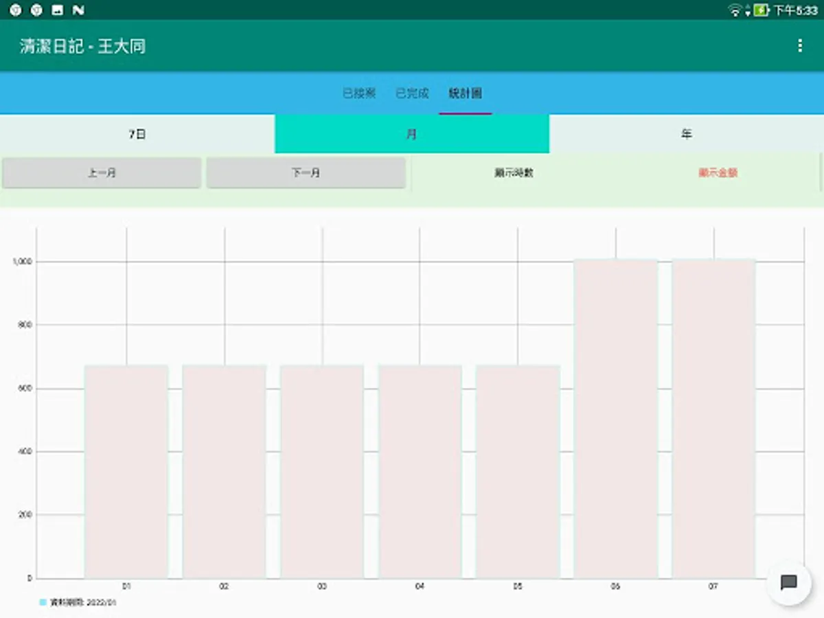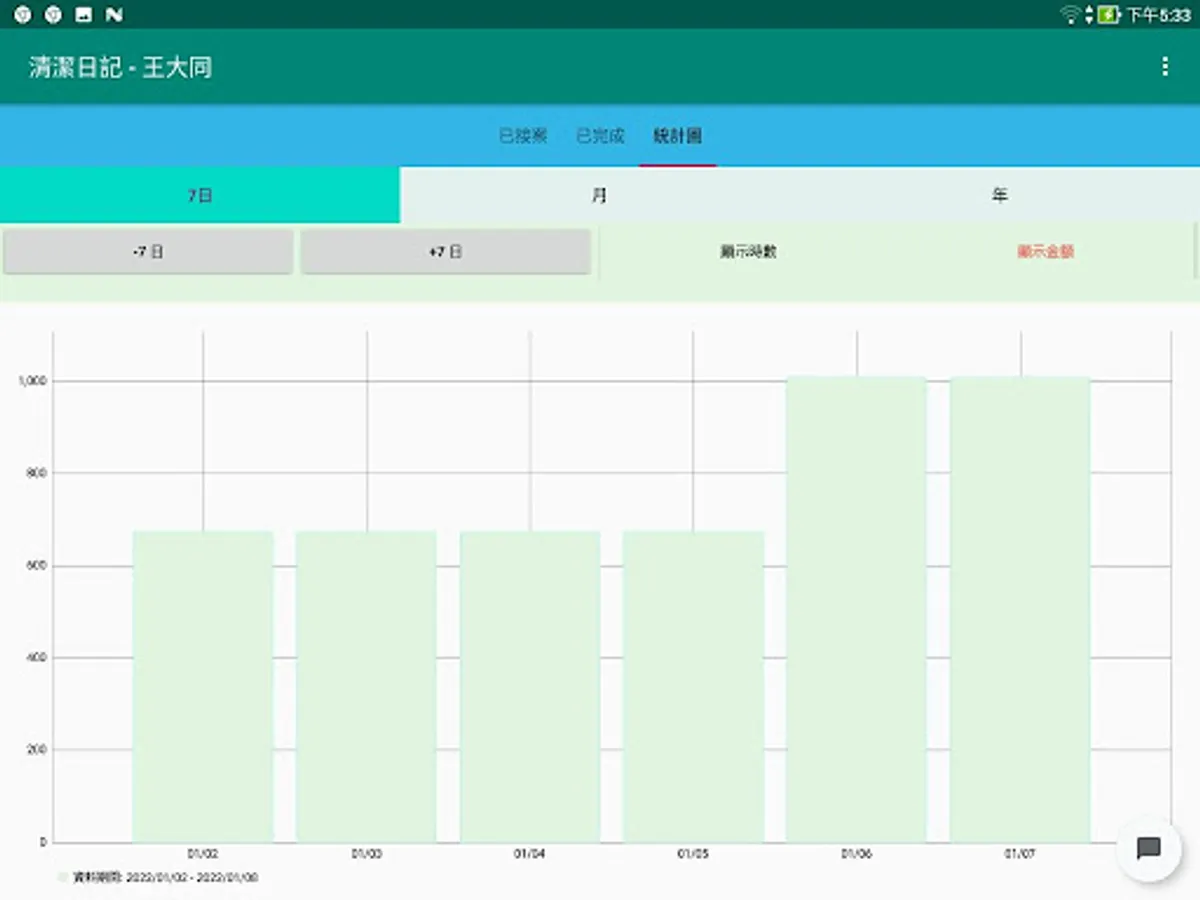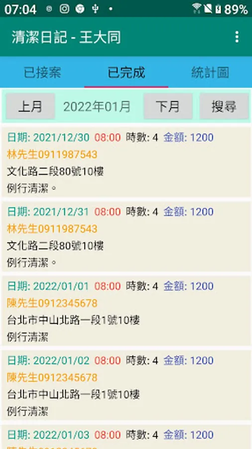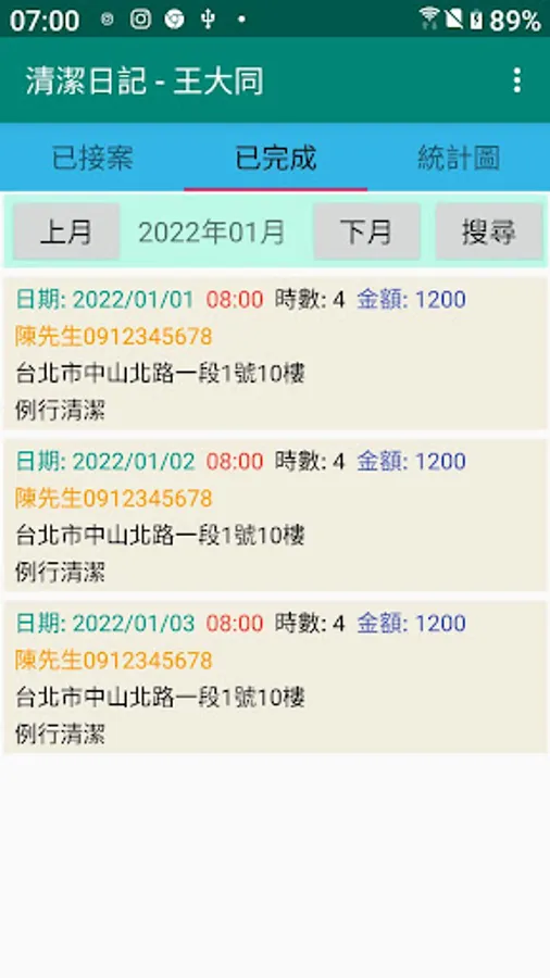 When you receive a job notification, go to the accepted case page, press the add button and enter the relevant information about the job, and when the job is actually completed, mark the case as completed. This APP can record the work that has been received but not completed, and the data of the completed work, and summarize statistical charts such as 7 days, months, and years, which is quite practical.