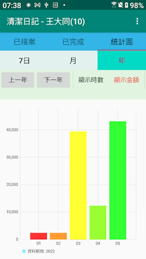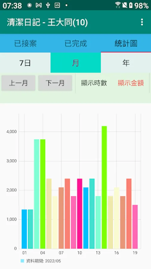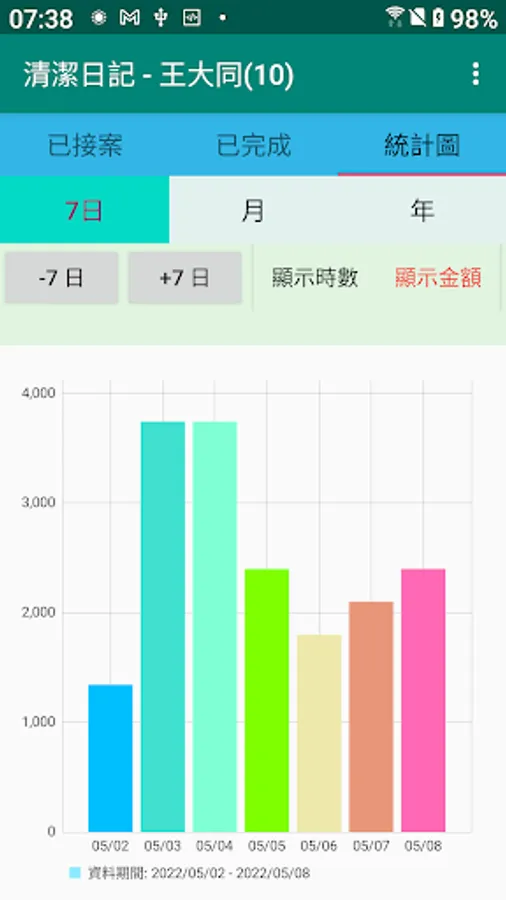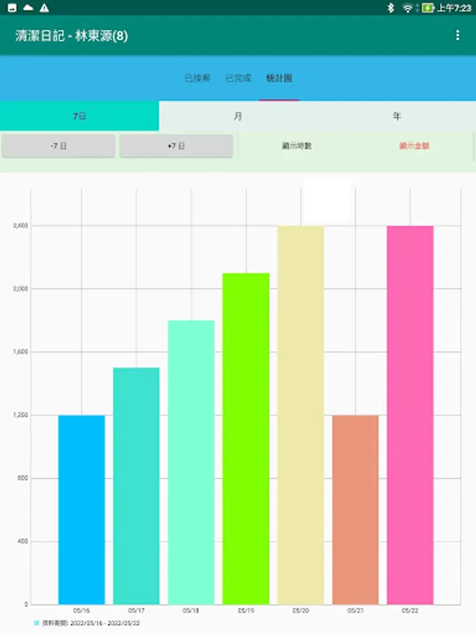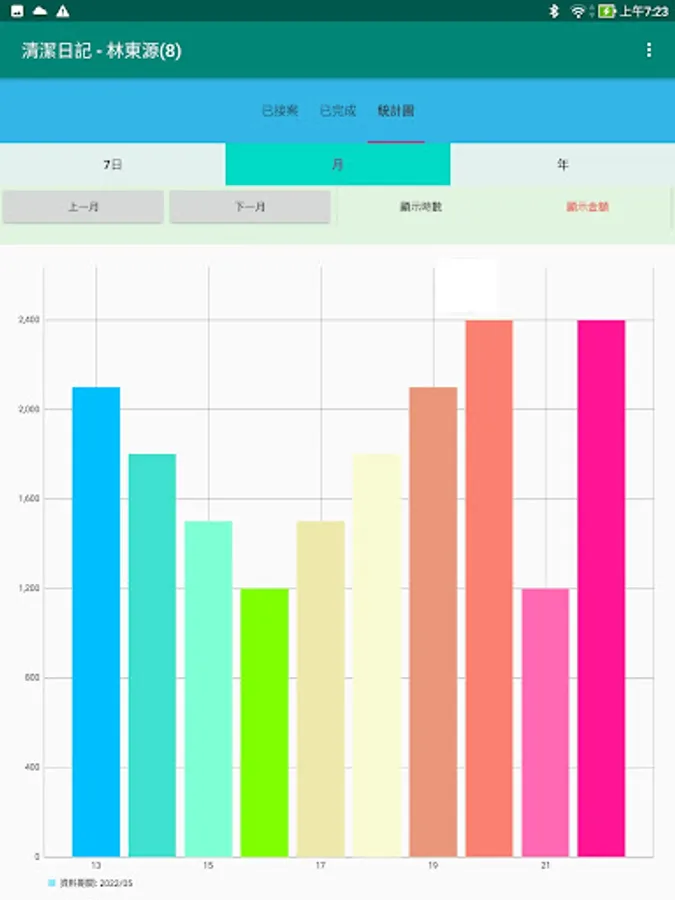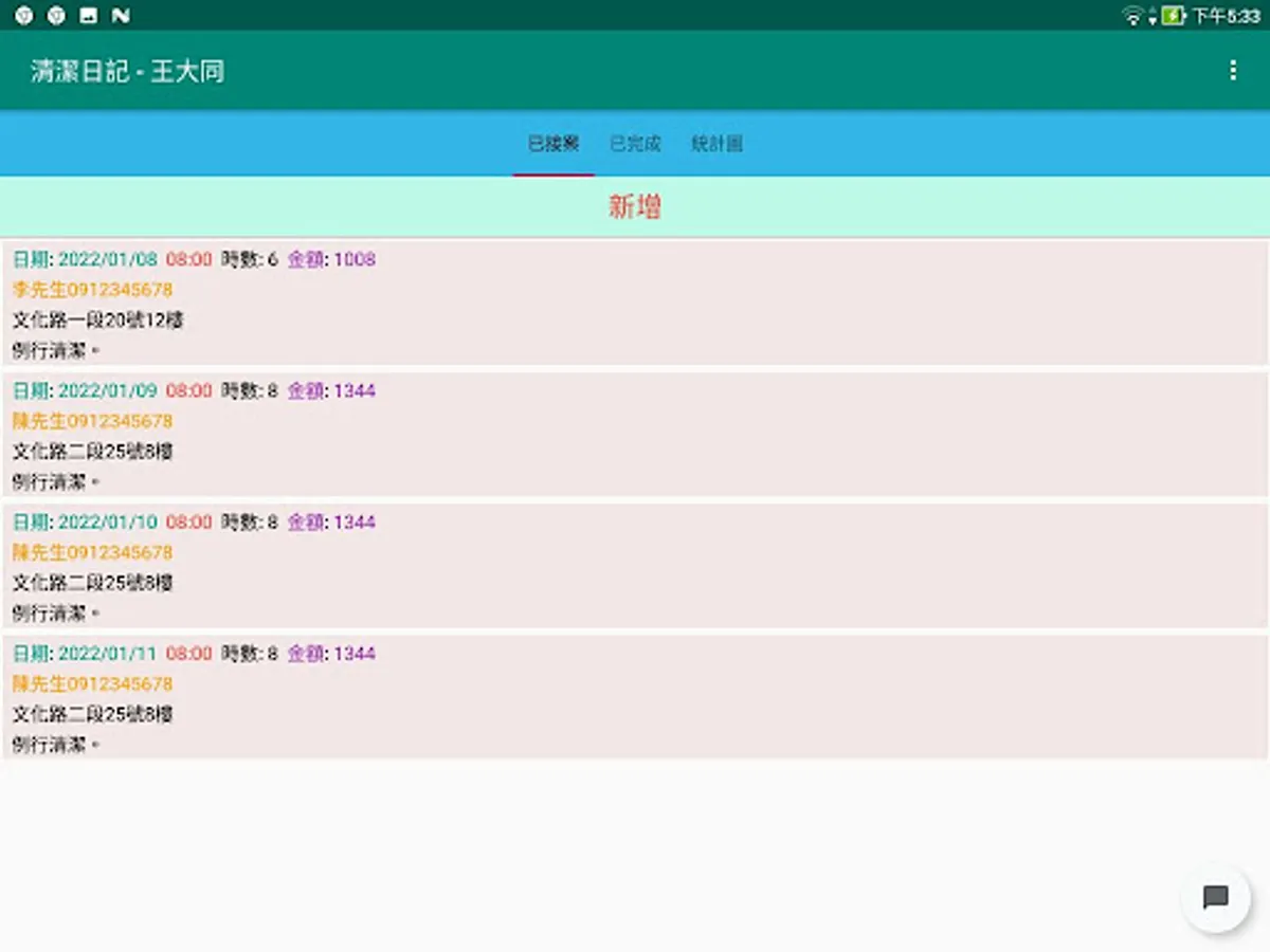 When you receive a job notification, go to the accepted case page, press the add button and enter the relevant information about the job, and when the job is actually completed, mark the case as completed. This APP can record the work that has been received but not completed, and the data of the completed work, and summarize statistical charts such as 7 days, months, and years, which is quite practical.