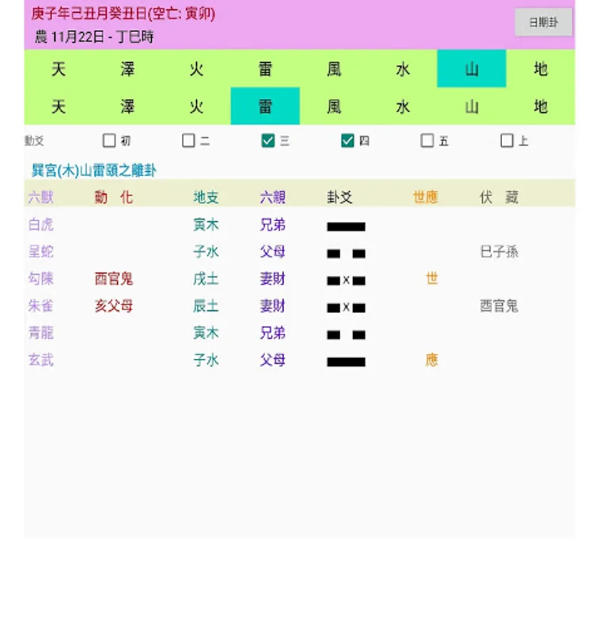 Together with the lunar calendar, solar terms and movement lines form a complete hexagram image. Because of its unique changes, a slight negligence will completely invalidate the incorrect interpretation of the hexagrams.