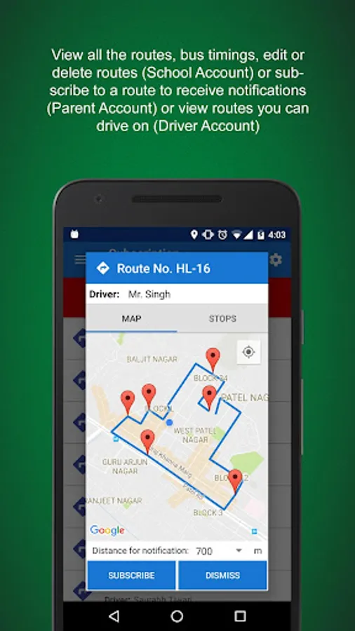 • Subscribe to a bus stop via a bus route to receive notifications when the bus starts it journey, is about to reach your stop and reaches back school (requires an internet connection)