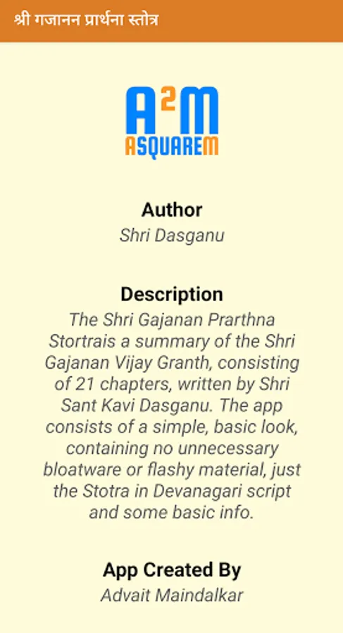 The app purposefully has a basic, simple look, containing no unnecessary bloatware or flashy material; just the Stotra in Devanagari script and some basic info regarding the same, to provide a distraction free reading experience.