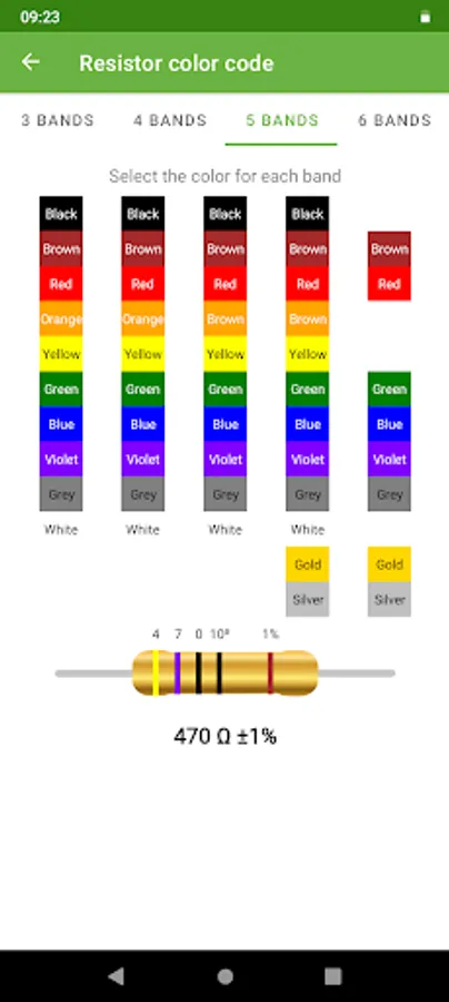 - Resistor color code (3 bands, 4 bands, 5 bands, 6 bands)