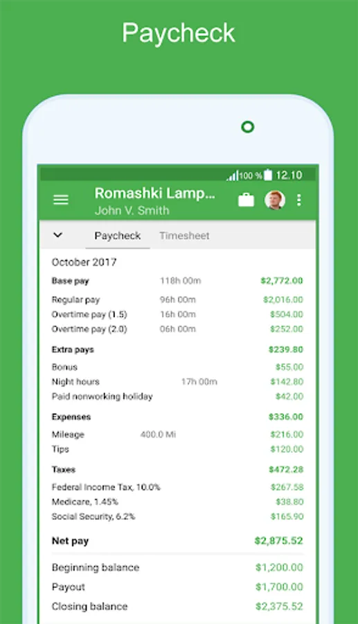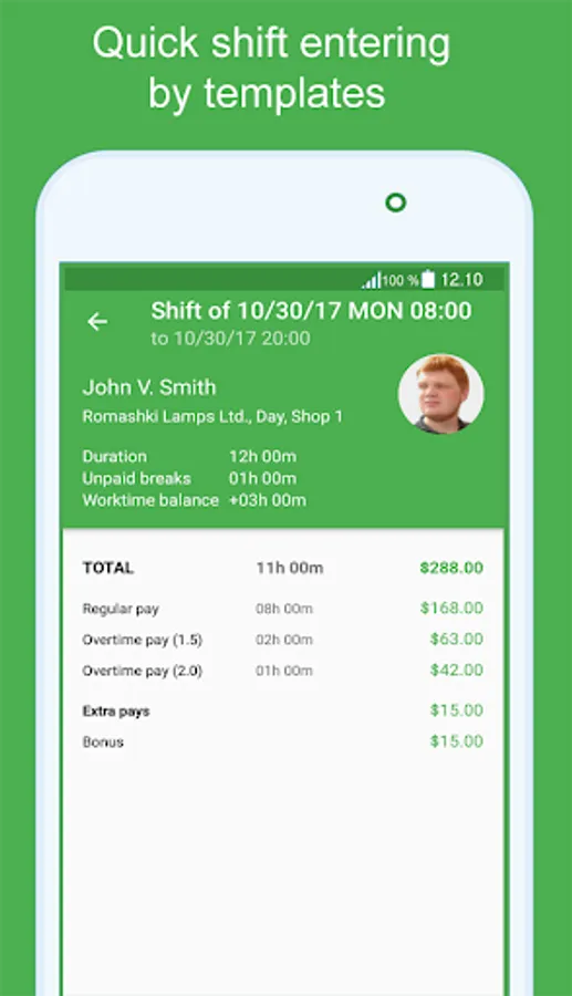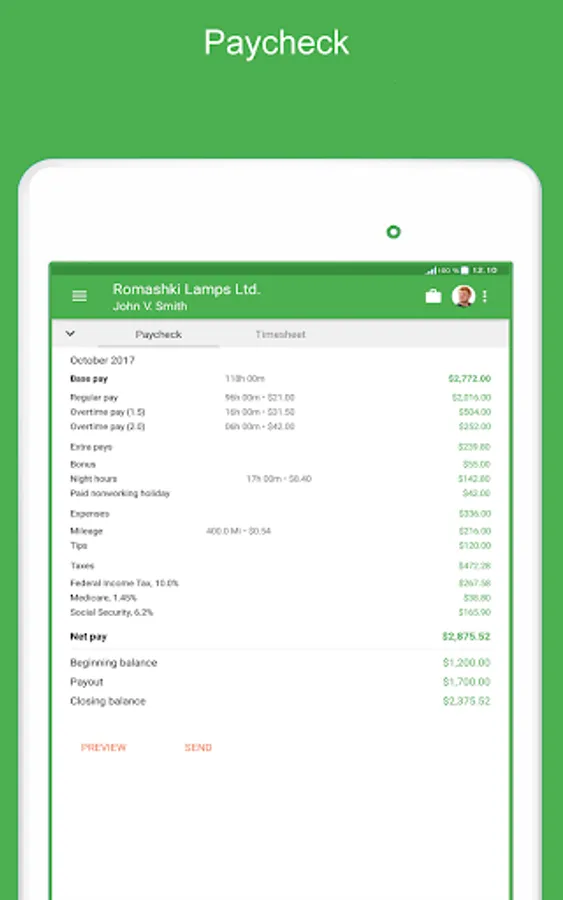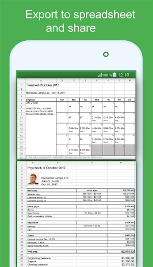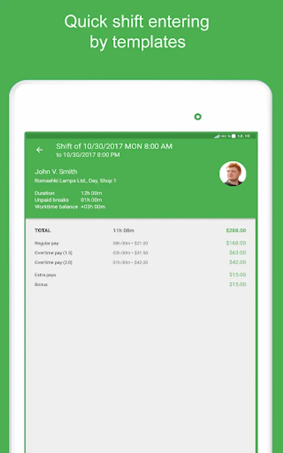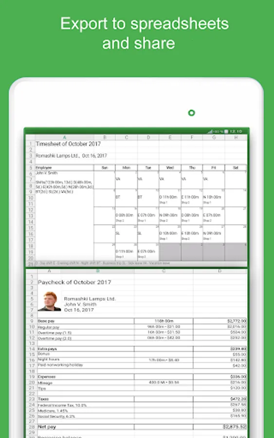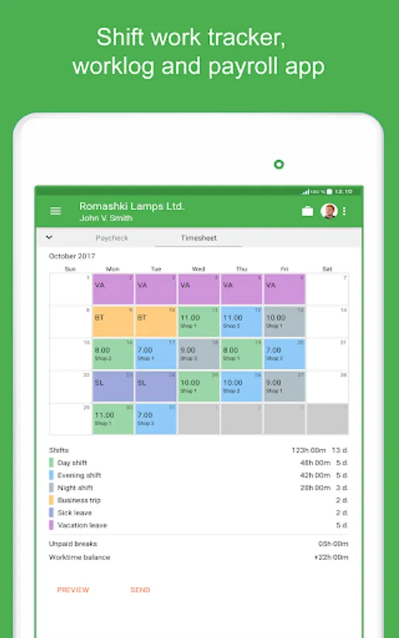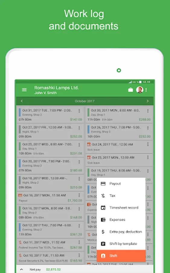 Green Timesheet is an easy way for shift work tracking, payroll (regular and overtime hours, extra pay for night work, customizable extra pays and deductions, auto breaks, piecework calculator, taxes and payouts) and business expenses tracking.