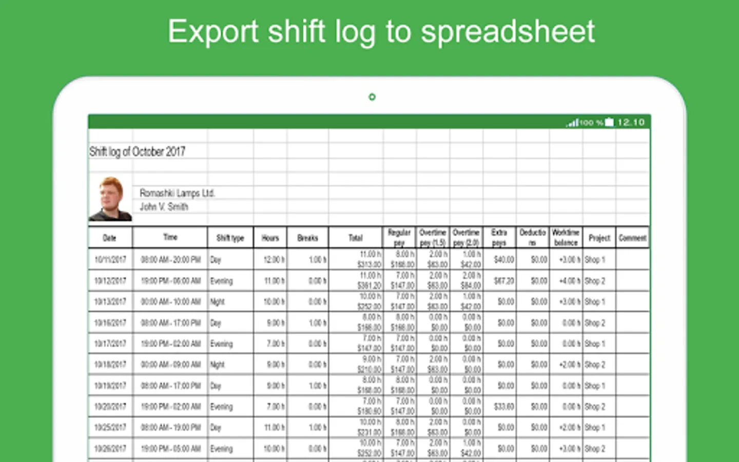 Timesheets can be exported to the spreadsheet and shared with employer.