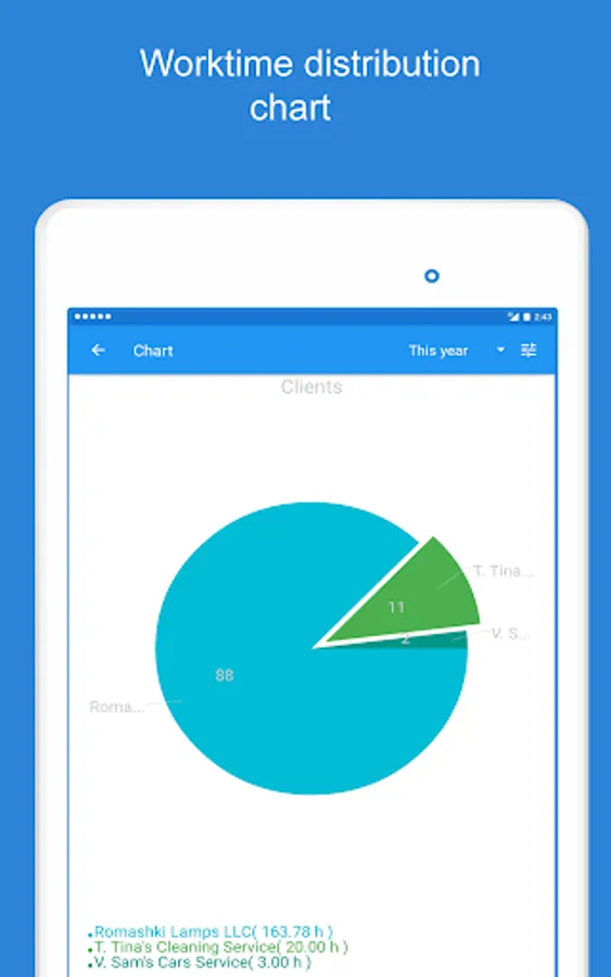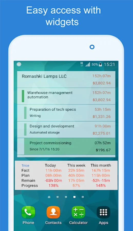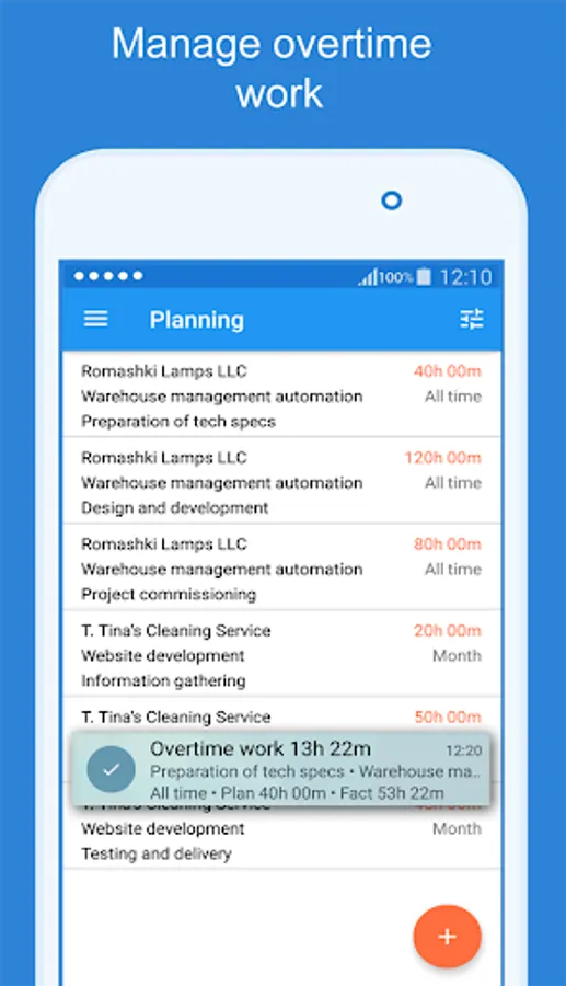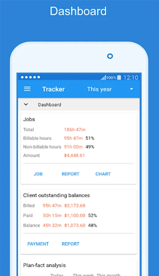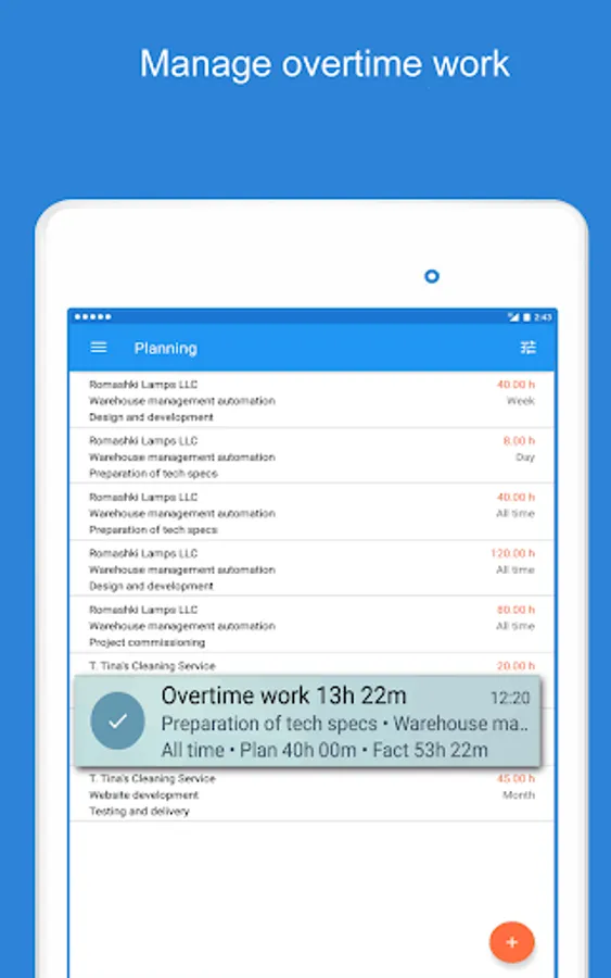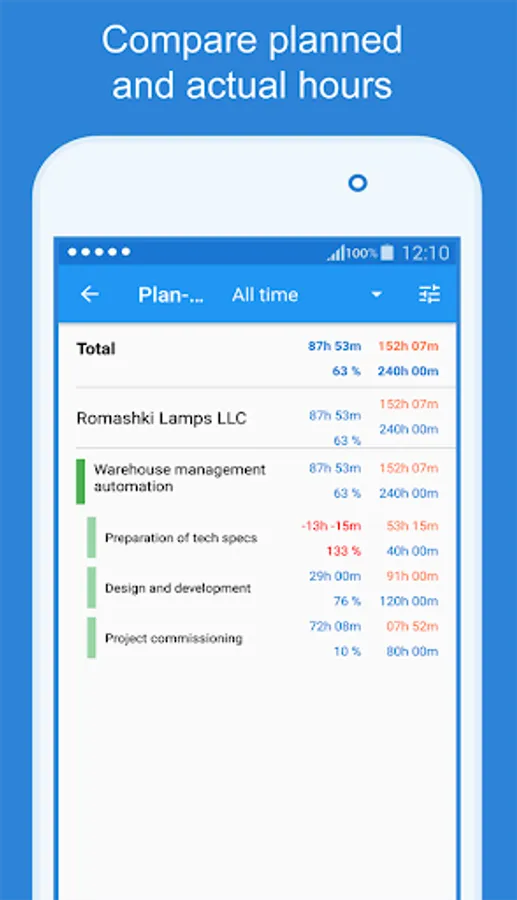 Manage your workday with plan-fact analysis report, handy widget with planned and actual hours. The tracking app additionally shows you progress bars in the landscape orientation.