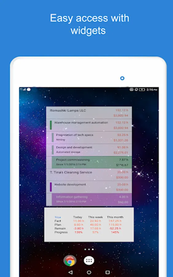 Place an app widget on the home screen for easy access of timekeeping. You can track the projects simultaneously.