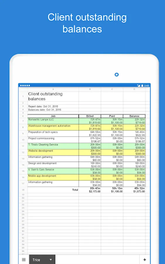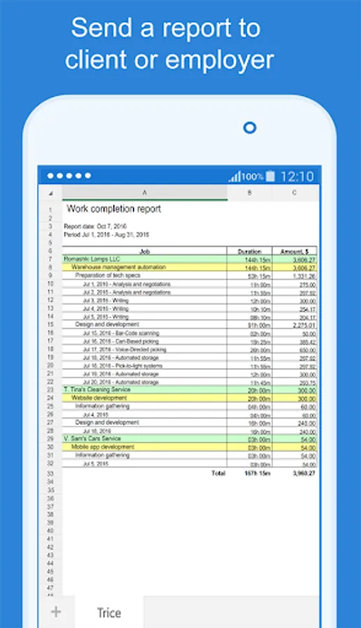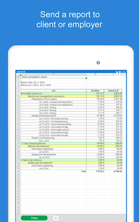 Generate and send a Work Completion Report for selected period by projects, jobs and dates as spreadsheet to client or employer. The report can be used as completed work confirmation, billing and invoicing, timesheet filling out.