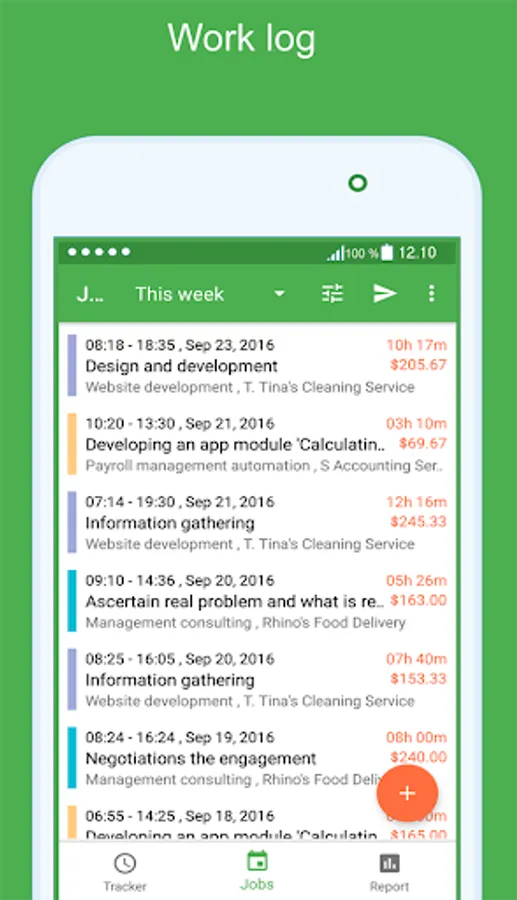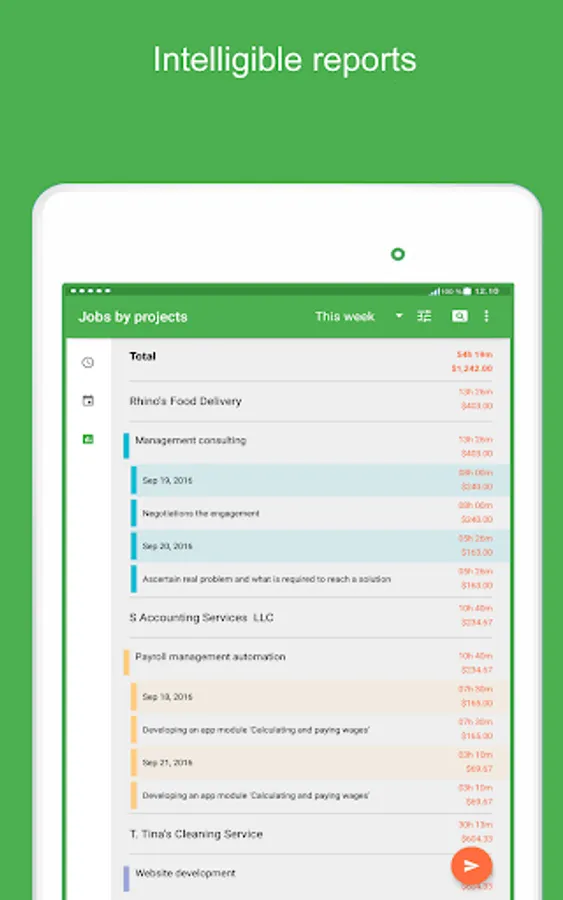 You can generate and send the report for selected period by projects, jobs and dates (Microsoft Excel™ format) to client or employer. The report can be used as completed work confirmation, billing and invoicing, timesheet filling out.