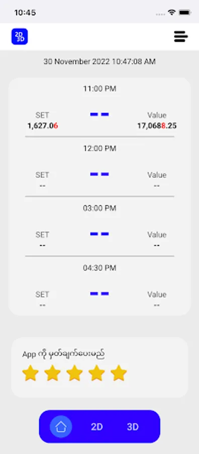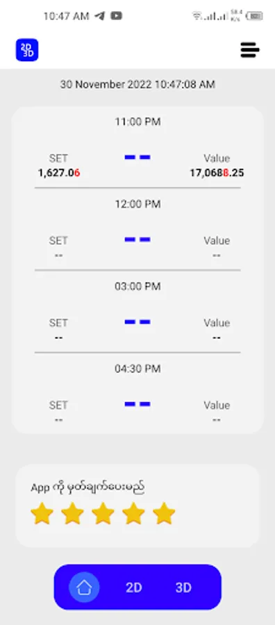 2D3D Myanmar Data : Myanmar 2D3D app provides real time thai set index 2d3d results. 2d3d app also include 2D calendar , 3D calendar, predictions