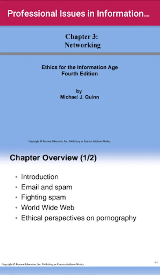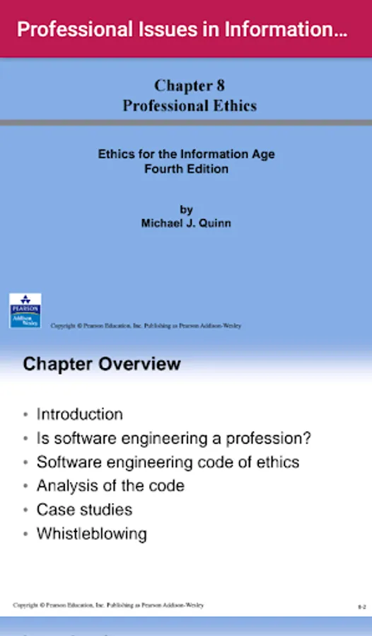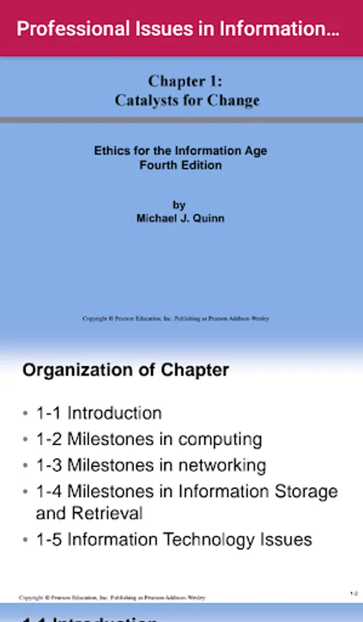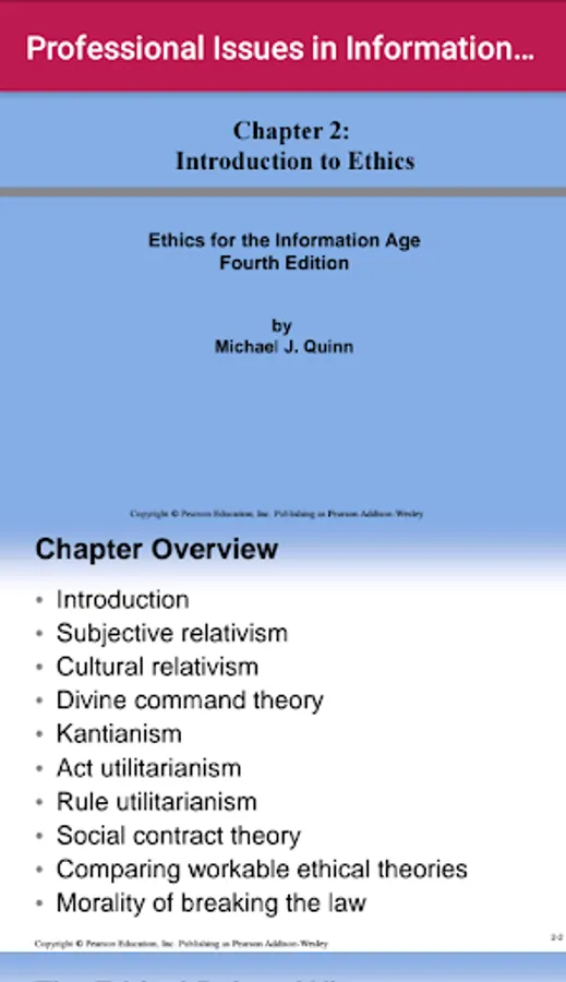 This app contains slides that were created and compiled by Michael J. Quinn - the author of the book titled "Ethics for the Information Age".