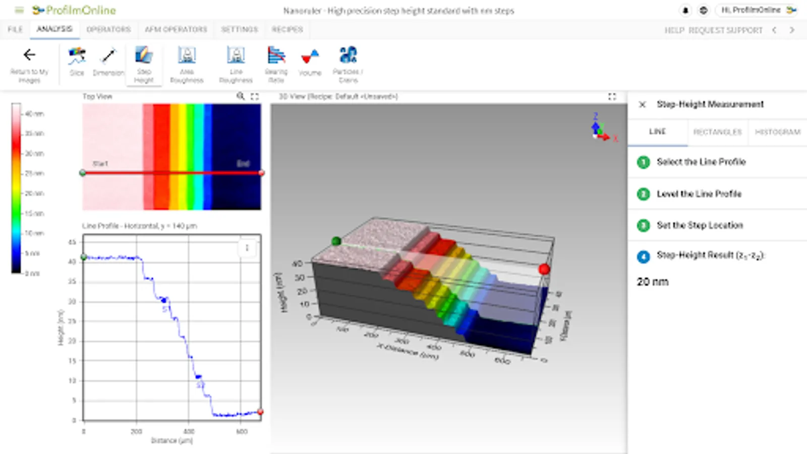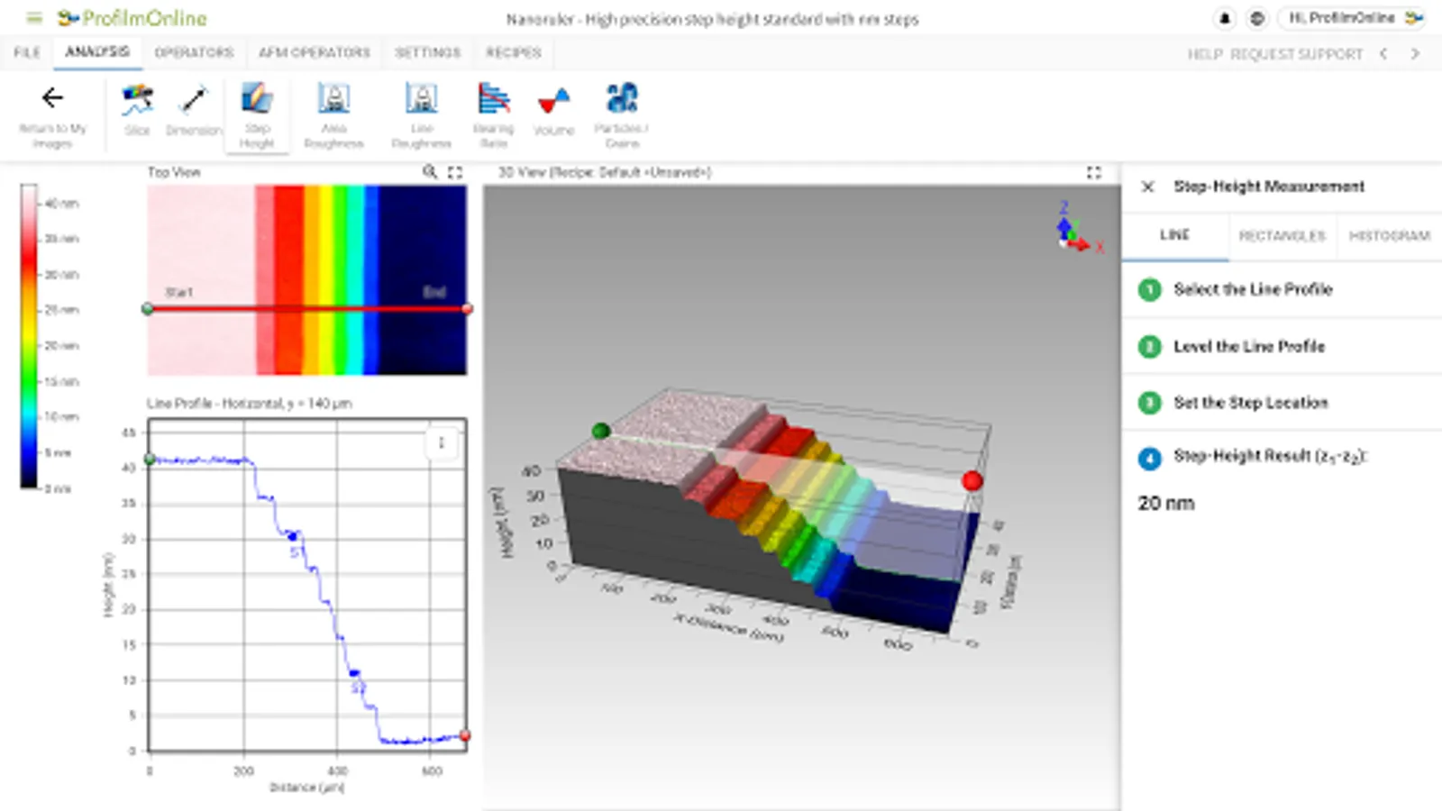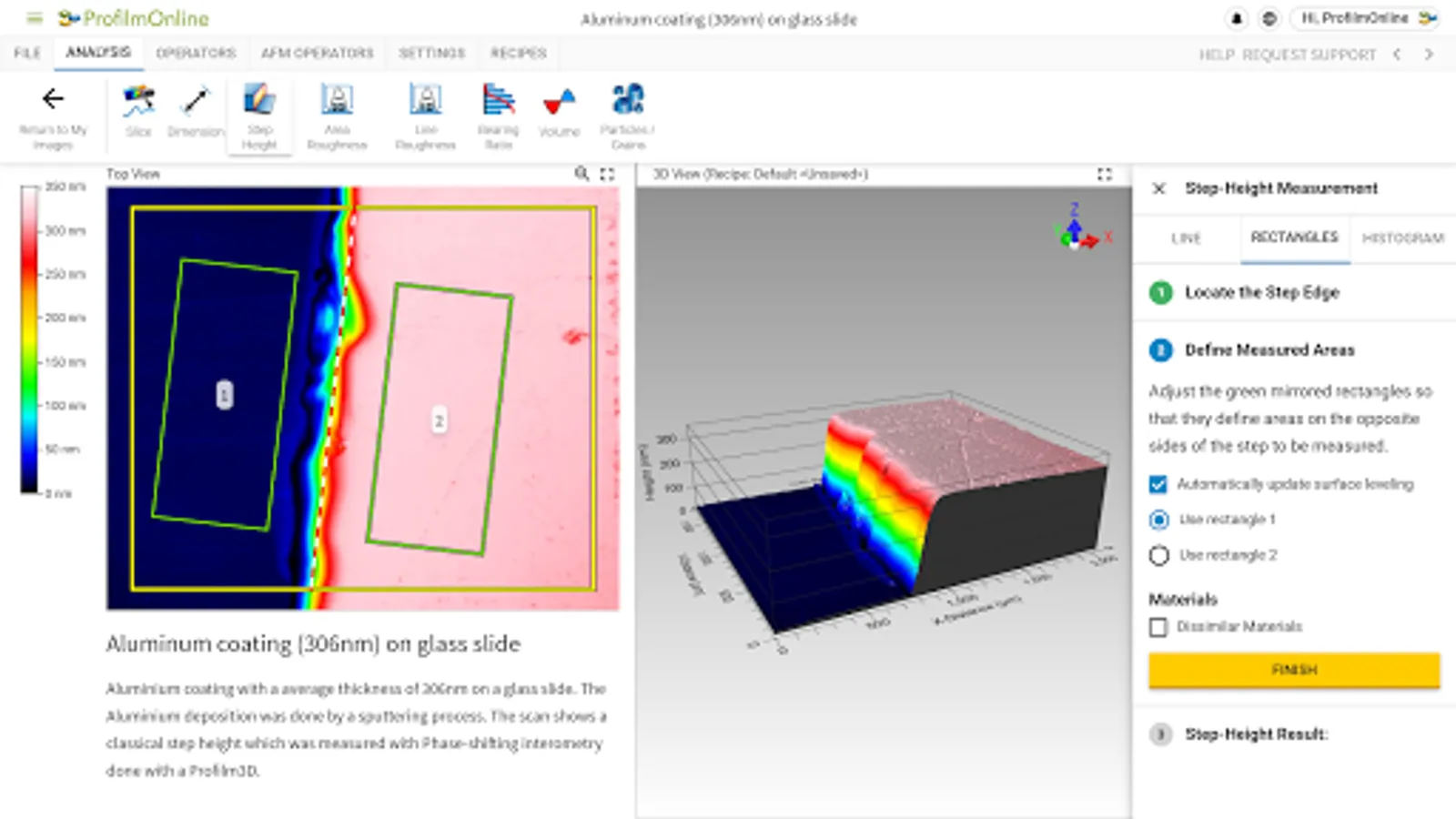 ProfilmOnline lets you store, share, view, and analyze 3D images. Profilometers, AFMs, and other 3D microscopes produce surface topography and other related images which can be uploaded to your private gallery. You can view and analyze your images, quickly and easily share them with others, and view images shared by others. ProfilmOnline includes sophisticated image processing operators to perform functions such as filtering noise, eliminating defects, leveling, cropping, and others. It also includes analysis modes such as step height, roughness, cross-section, dimension, and volume.