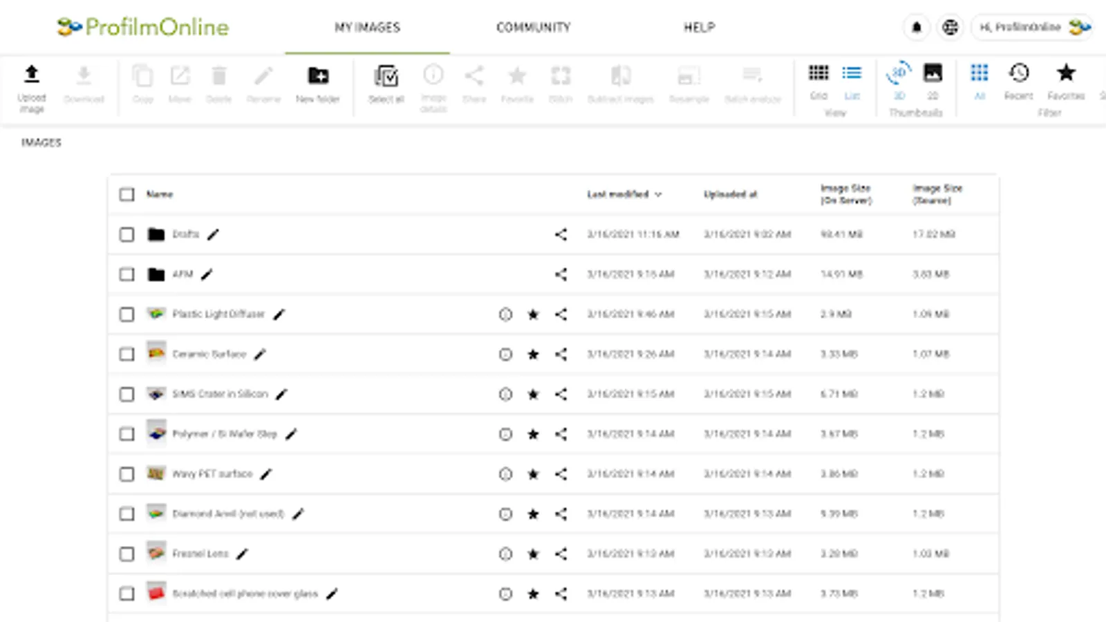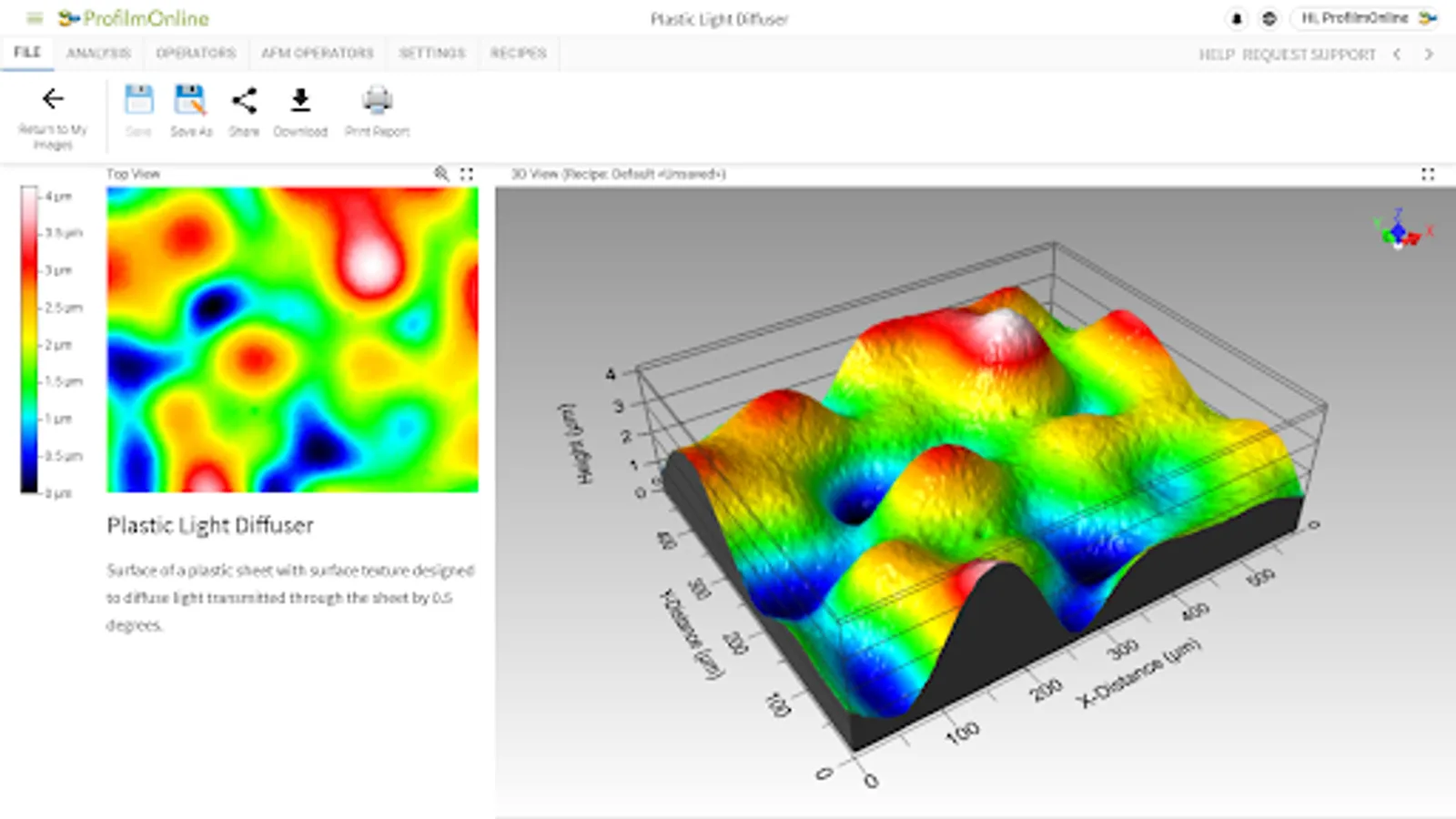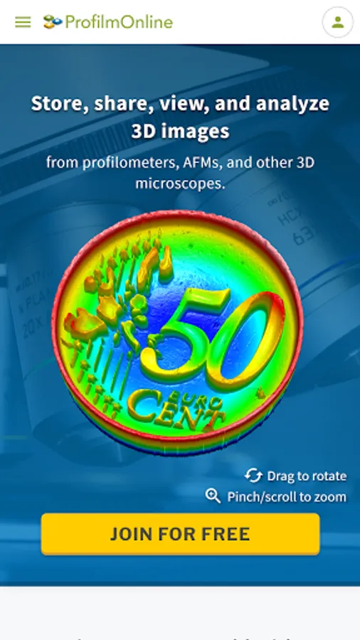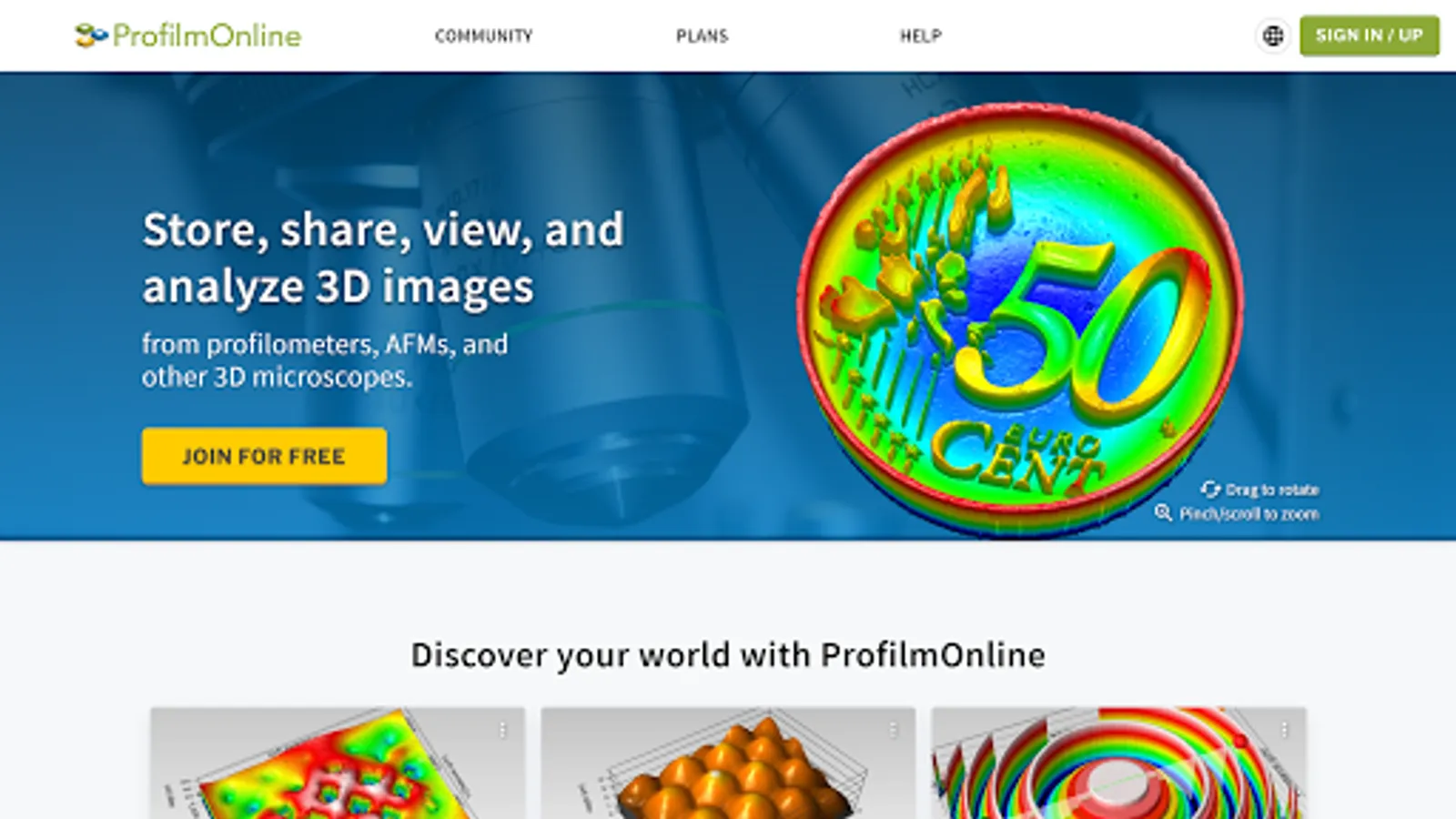 ProfilmOnline lets you store, share, view, and analyze 3D images. Profilometers, AFMs, and other 3D microscopes produce surface topography and other related images which can be uploaded to your private gallery. You can view and analyze your images, quickly and easily share them with others, and view images shared by others. ProfilmOnline includes sophisticated image processing operators to perform functions such as filtering noise, eliminating defects, leveling, cropping, and others. It also includes analysis modes such as step height, roughness, cross-section, dimension, and volume.