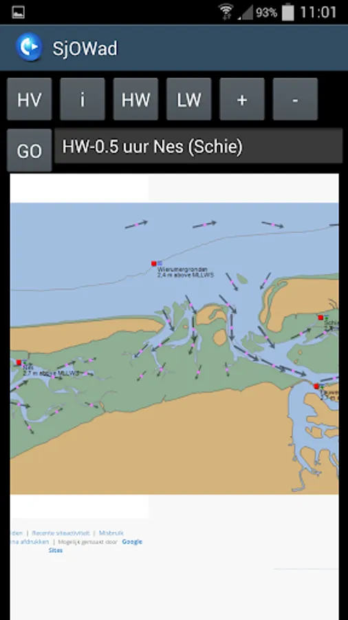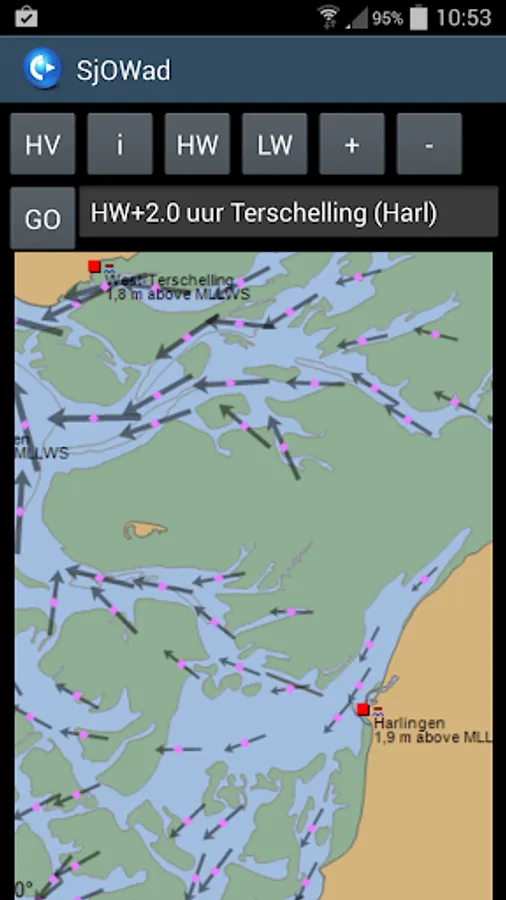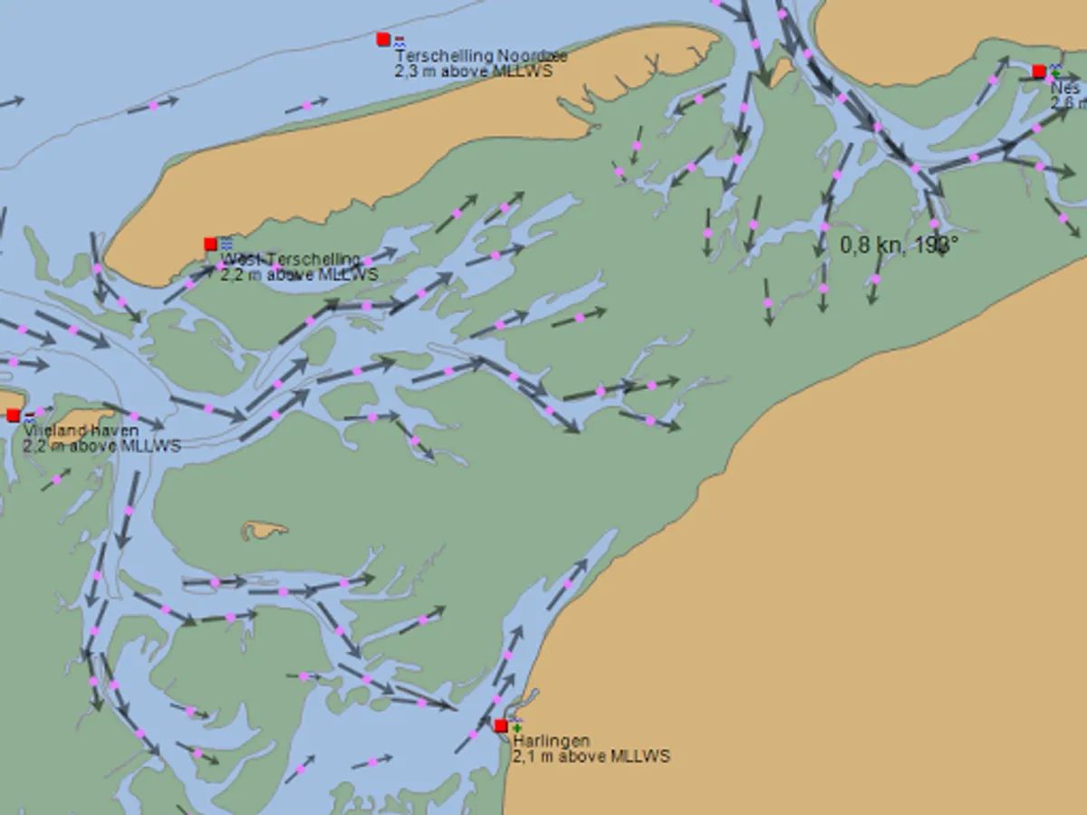 Dynamic flow atlas of the Wadden Sea with selection start and target ports, suitable for mobile and tablet. Published under license from the British Navy (Dutch navy also uses these cards). No download of an application with a very high MB content, but each time quickly and easily bringing in maps, calculated from high respectively. low water. All ports on the mudflats have Internet facilities.